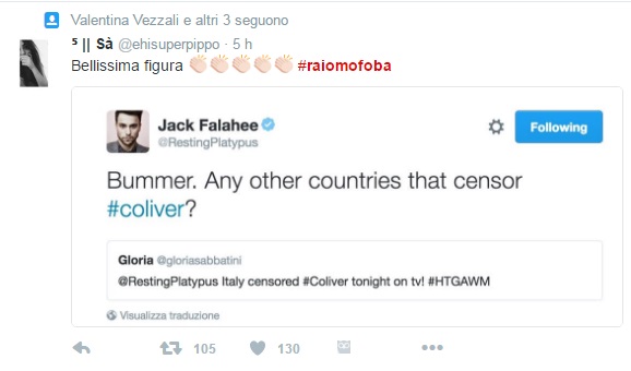 E a prendere posizione è anche il Circolo di Cultura omosessuale Mario Mieli che esprime in una nota ”tutto il suo sdegno”. ”E’ stato censurato l’amore fra i due personaggi maschili Connor e Oliver – spiega ancora la nota – decidendo invece di mantenere inalterate, invece, tutte quelle riguardanti le storie eterosessuali”.