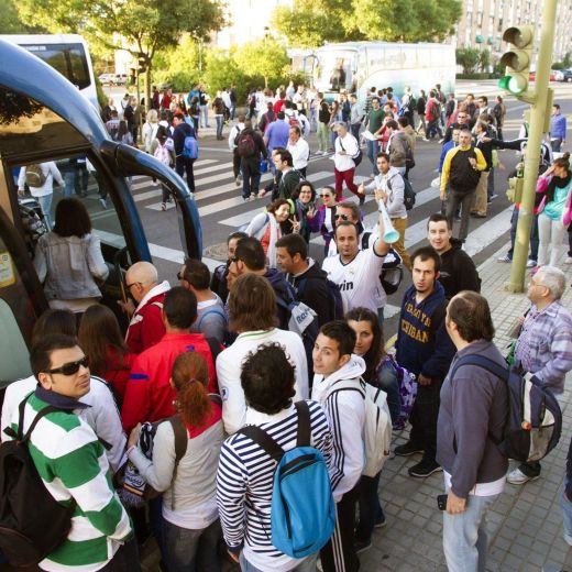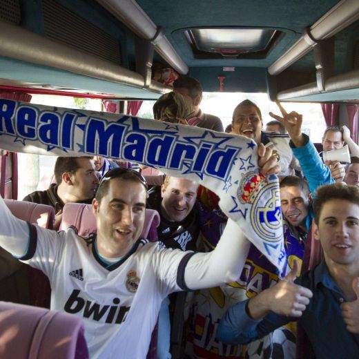 Nelle foto Ansa; i tifosi del Real Madrid applaudono a bordo di un autobus in partenza dalla cittร di Badajoz, proprio al confine tra Spagna e Portogallo, a Lisbona, il 24 maggio 2014. Migliaia di tifosi del Real Madrid e Atletico Madrid sono attesi nelle prossime ore a Lisbona per assistere alla presa finale luogo di UEFA Champions League allo stadio Estadio da Luz.