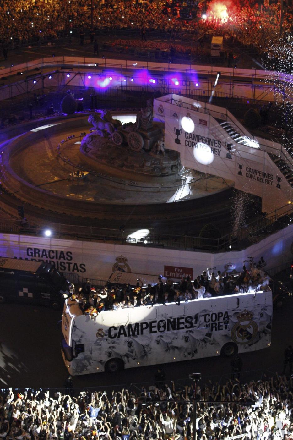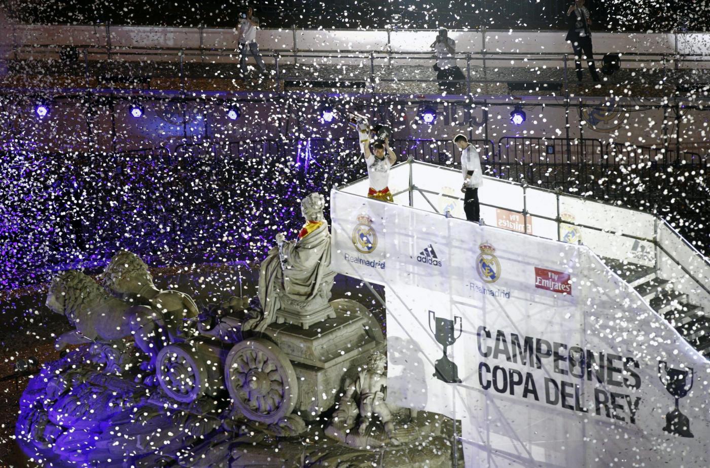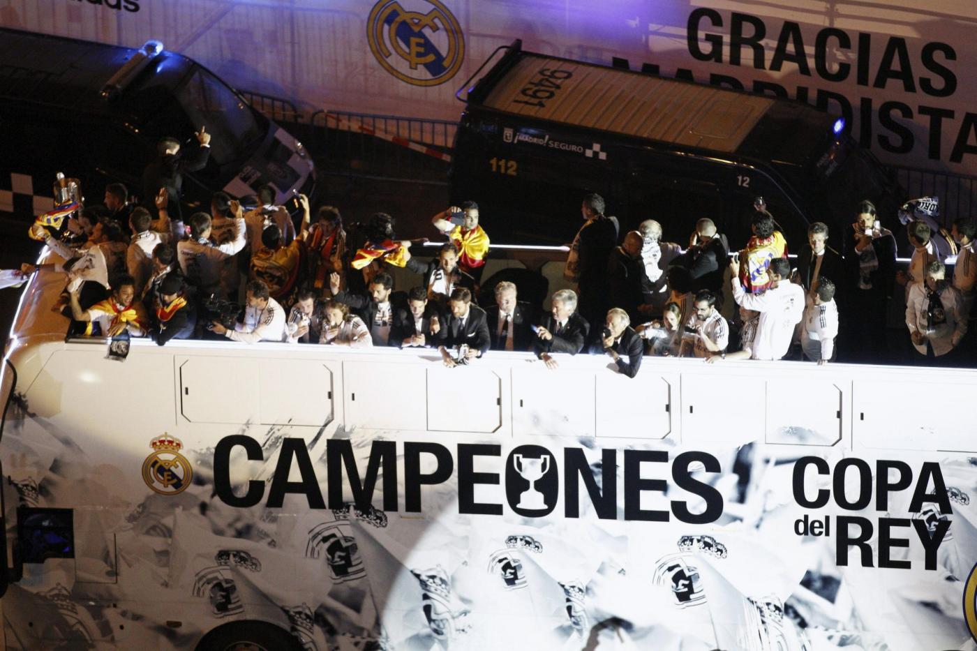 MADRID – Dopo il trionfo del Real Madrid sul Barcellona al ‘Mestalla’ di Valencia, sono proseguite fino a tarda notte nella capitale spagnola i festeggiamenti per la conquista della Coppa del Re, primo trofeo stagionale conquistato dalla squadra di Carlo Ancelotti. La partita si è conclusa 2-1, con le reti di Di Maria, Bartra e Bale.