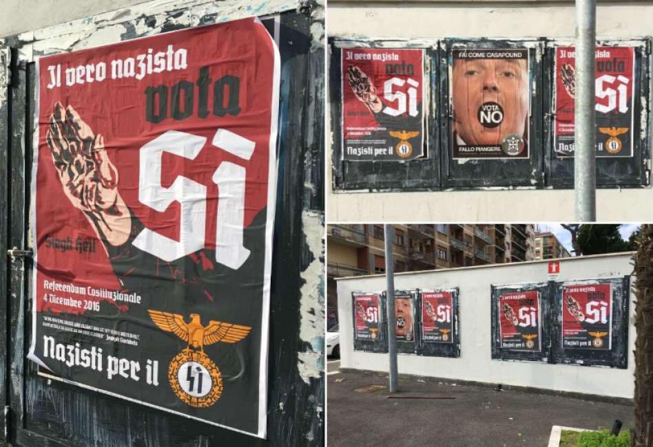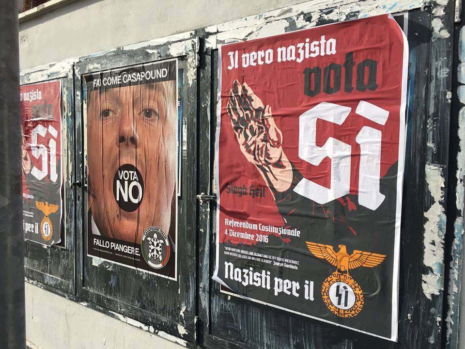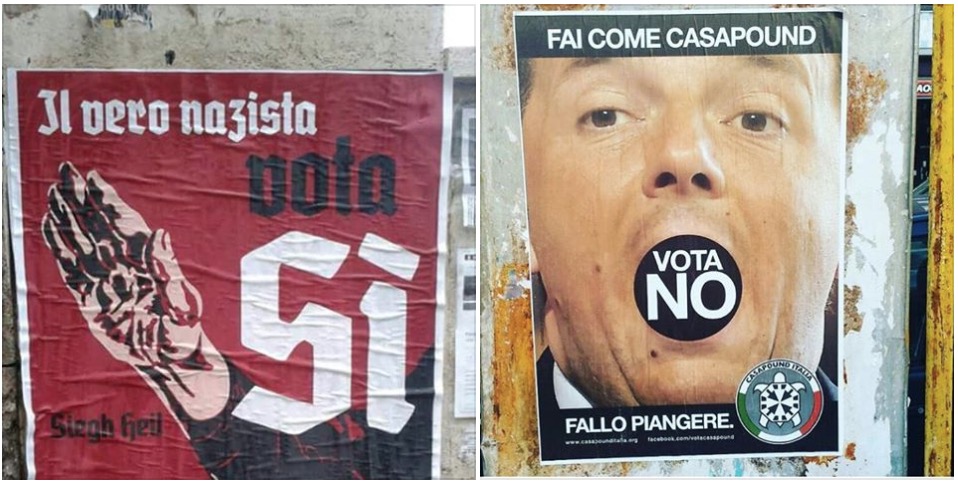 I manifesti dei “nazisti” in alcuni casi sono stati affissi accanto a quelli dei “fascisti del terzo millennio” di Casapound che incitavano a votare per i No: un “Vota No” bocca a Renzi e lo slogan “Fai come Casapound. Fallo piangere”.