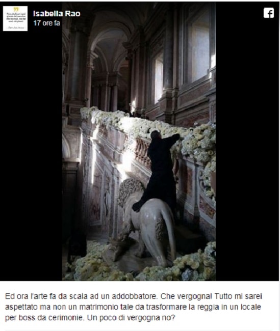 Il matrimonio in questione è quello di Angela Ammaturo, ad del marchio di moda Frankie Morello. La foto dell’addobbatore in piedi sul cavallo ha attirato l’attenzione del popolo social con una lunga scia di prese di posizione. C’è chi giudica la scena orribile, chi una “grande pacchianata”, chi si limita a ricordare che tutti i turisti salgono sui due leoni in cima allo scalone per farsi foto, “e nessuno si è mai scandalizzato”, chi fa i complimenti al manager bolognese, Mauro Felicori, cui viene riconosciuto il lavoro di rilancio della Reggia e lo incita ad andare avanti.