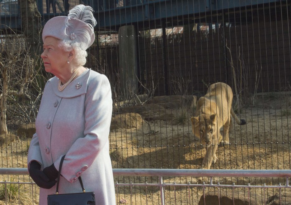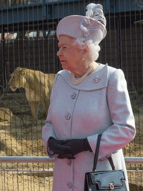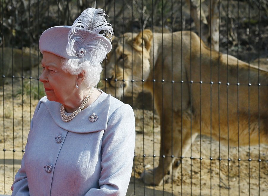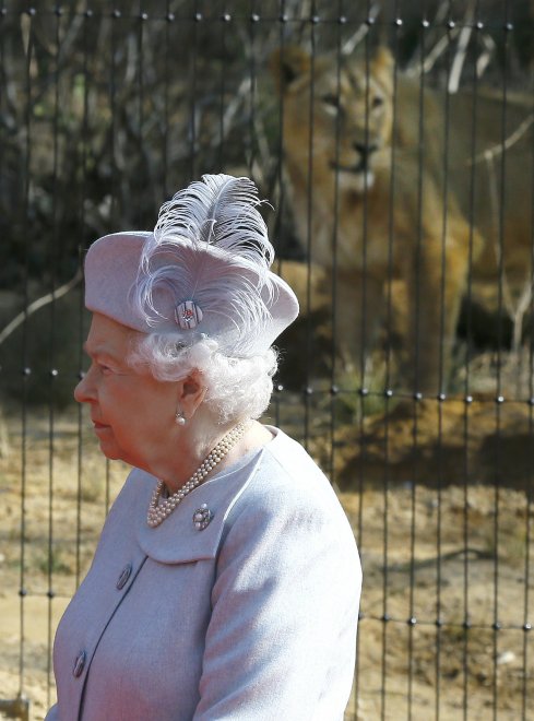 Alle sue spalle, una leonessa è stata immortalata dai fotografi presenti mentre si lecca i baffi. Il felino a quanto pare, avrebbe puntato il vistoso cappello indossato dalla sovrana.