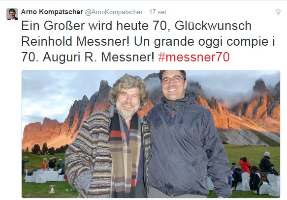 “Ora ho ancora la voglia e la forza di dormire all’aperto, a 80 anni forse non più”, ha giustificato questa scelta il Re degli Ottomila. Alla festa ha anche partecipato il governatore altoatesino Arno Kompatscher, che su Twitter ha pubblicato una foto con il tweet “Un grande oggi compie 70 anni”. (Foto Lapresse).