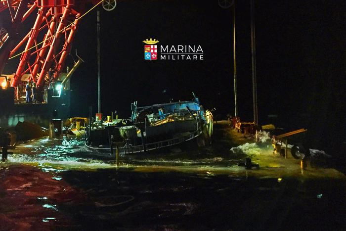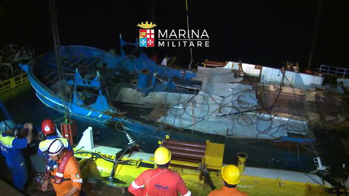 A rendere noto l’arrivo di quel che resta del peschereccio è stato il comandante Marittimo Sicilia, contrammiraglio Nicola de Felice, incontrando i giornalisti. Il barcone è stato agganciato tre giorni fa e sollevato dal fondale con un modulo di recupero da nave Ievoli Ivory. In zona era presente nave San Giorgio della Marina Militare, che fornisce la protezione a tutto il dispositivo navale, con imbarcati oltre al personale del Gruppo Operativo Subacquei della Marina, una squadra di Vigili del Fuoco che ha il compito di effettuare i primi rilievi sul relitto e anticipare le informazioni utili. Il relitto sarà collocato all’interno di una tensostruttura refrigerata, lunga 30 metri, larga 20 e alta 10, dove inizieranno le operazioni di recupero delle salme.