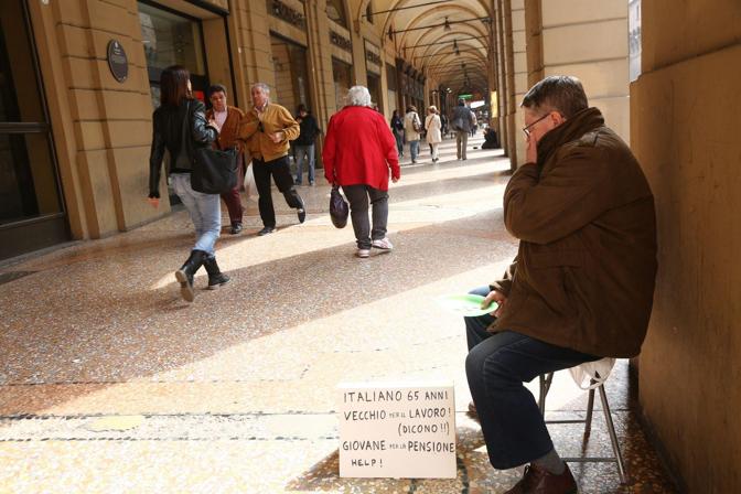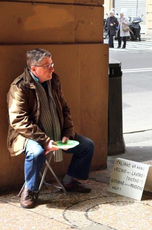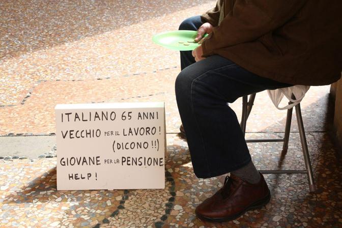 Distinto, ben vestito, estremamente dignitoso. E’ uno di noi che la crisi ha ridotto così: lavorava in una società di marketing a Ferrara, poi questa ha chiuso ed è stato licenziato. Ma la riforma Monti-Fornero ha stabilito che per lui, la pensione, arriverà tra un anno abbondante, quando avrà 67 anni. Ora ne ha 65 e, oltre alle pulizie negli stabilimenti d’estate, nessuno lo vuole: troppo avanti con gli anni per lavorare, troppo giovane per la pensione. Un paradosso che lui ha sintetizzato nel cartello che espone con cui chiede l’elemosina. “Italiano 65 anni. Vecchio per il lavoro (dicono!!!). Giovane per la pensione. Help”.