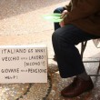 Distinto, ben vestito, estremamente dignitoso. E’ uno di noi che la crisi ha ridotto così: lavorava in una società di marketing a Ferrara, poi questa ha chiuso ed è stato licenziato. Ma la riforma Monti-Fornero ha stabilito che per lui, la pensione, arriverà tra un anno abbondante, quando avrà 67 anni. Ora ne ha 65 e, oltre alle pulizie negli stabilimenti d’estate, nessuno lo vuole: troppo avanti con gli anni per lavorare, troppo giovane per la pensione. Un paradosso che lui ha sintetizzato nel cartello che espone con cui chiede l’elemosina. “Italiano 65 anni. Vecchio per il lavoro (dicono!!!). Giovane per la pensione. Help”.