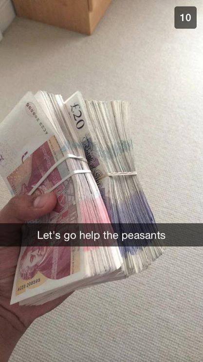 Nella pagina si vedono le foto di giovani ragazzi che ostentano la loro ricchezza, in posa con macchine lussuose o che tengono contanti nella scatola delle salviette, suggerendo che si soffiano il naso con le banconote. Prendono in giro le persone meno abbienti e in una fotografia descrivono i clienti in attesa fuori dal negozio Primark come contadini. Mentre in un’altra immagine , un ricco giovanotto sembra pulirsi le scarpe con una banconota da £ 50 con la didascalia. “Quando un contadino mi tocca le scarpe”.