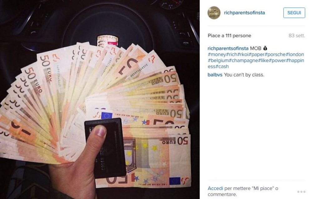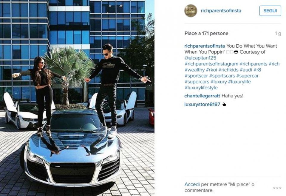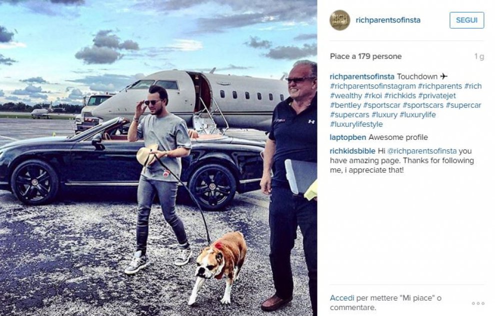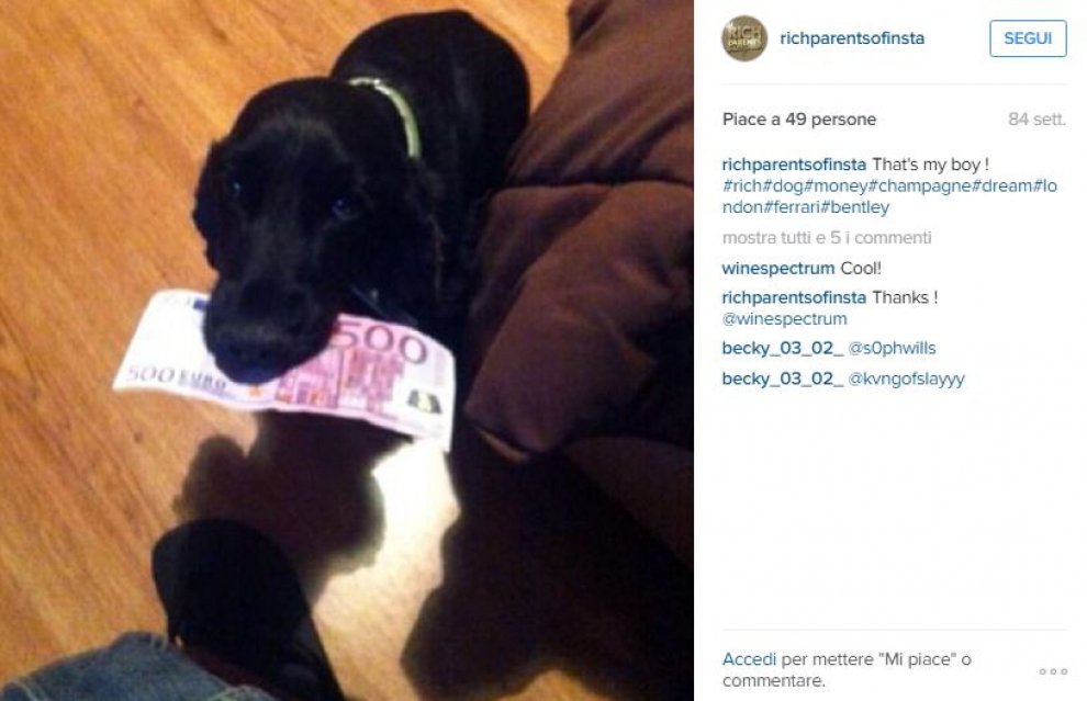 In questo caso però, a prevalere sono senza ombra di dubbio le auto, gli aerei privati e le banconote Nei commenti si legge che qualche genitore ultra ricco accompagna la figlia a fare shopping e che si regalano banconote da 500 euro al proprio cane per farlo giocare. Come per i figli, anche i genitori ricchi hanno collezionato migliaia di follower in pochissimo tempo.