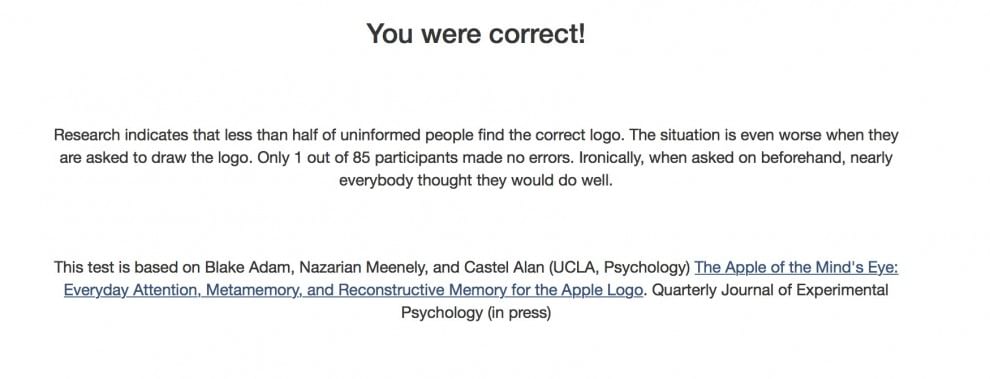 Il test dell’Università della California è diviso in due fasi. Nella prima i ricercatori hanno chiesto ai partecipanti di disegnare il logo a memoria: solo una persona su 85 è riuscita a riprodurlo in modo corretto (sia per quanto riguarda la forma della mela che per l’orientamento della foglia). In seguito hanno chiesto di riconoscere il logo esatto tra 12 alternative molto simili tra loro, ma anche qui la percentuale di successo non è stata all’altezza delle aspettative. Solo la metà ha infatti riconosciuto la mela giusta.