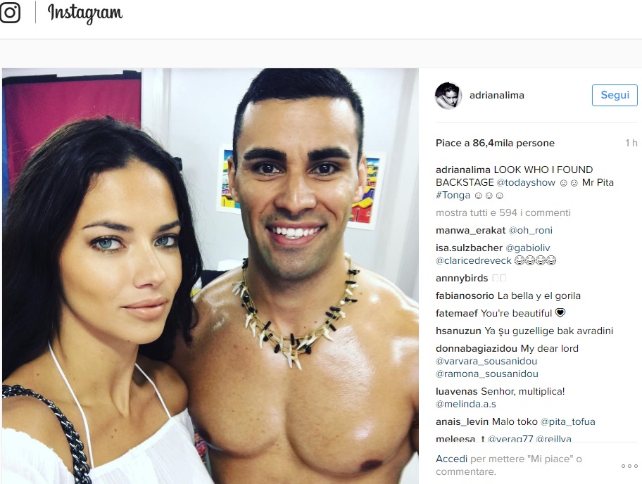 RIO DE JANEIRO – Lei con i suoi occhi verdi intriganti, lui con un bel sorriso e una collana etnica sul torso levigato. La supermodella brasiliana Adriana Lima ha appena postato su instagram una foto insieme con Pita Taukatofua, 32 anni e campione di taekwondoo, il portabandiera di Tonga la cui immagine è diventata virale su internet dopo aver sfilato al Maracanà a torso nudo e cosparso di olio.