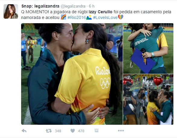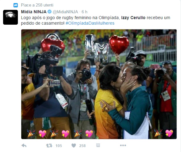 RIO DE JANEIRO – Richiesta di nozze con bacio lesbo sul campo. Accade alle Olimpiadi di Rio subito dopo la premiazione del rugby a sette femminile, dove l’Australia ha vinto l’oro contro la Nuova Zelanda Al termine della premiazione, la responsabile dei volontari del rubgy, la brasiliana Marjorie Enya, ha chiesto alla giocatrice del Brasile Izzy Cerullo di sposarla.
