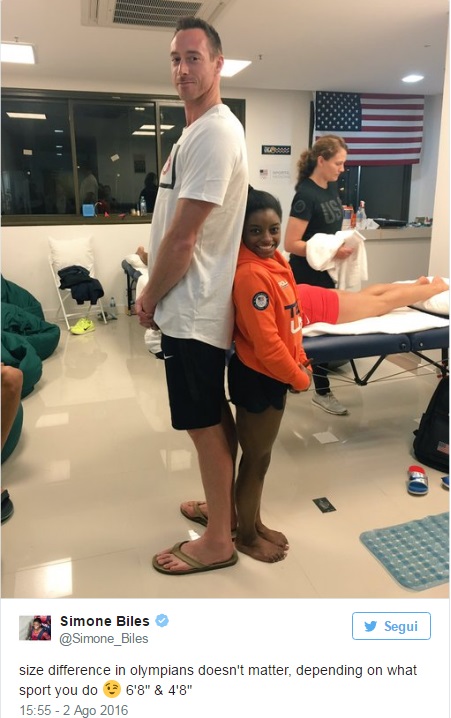 RIO DE JANEIRO – Nello sport esiste il pregiudizio legato al fisico. A dimostarlo è l’altela di ginnastica artistisca Simon Biles presente alle Olimpiadi Rio. La Biles posta sul suo profilo Twitter uno scatto in cui viene ritratta accanto ad un suo “collega” olimpionico, il pallavolista David Lee. Il loro fisici sono totalmente diversi: Lee è infatti slanciato, dal fisico muscoloso e con una corporatura asciutta. Lei scrive però che