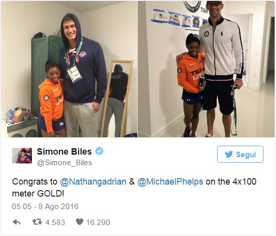 RIO DE JANEIRO – Nello sport esiste il pregiudizio legato al fisico. A dimostarlo è l’altela di ginnastica artistisca Simon Biles presente alle Olimpiadi Rio. La Biles posta sul suo profilo Twitter uno scatto in cui viene ritratta accanto ad un suo “collega” olimpionico, il pallavolista David Lee. Il loro fisici sono totalmente diversi: Lee è infatti slanciato, dal fisico muscoloso e con una corporatura asciutta. Lei scrive però che