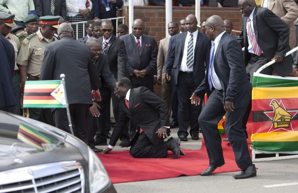 HARARE (ZIMBABWE) – Il presidente dello Zimbabwe Robert Mugabe, 91 anni a fine mese, appena arrivato in aeroporto tiene un discorso su un podio. Poi scende e cade sulle ginocchia davanti a centinaia di sostenitori e giornalisti. Dopo essere stato immediatamente soccorso, Mugabe viene aiutato dai suoi collaboratori a salire in auto per poi allontanarsi dallo scalo. Il governo di Harare ha provato subito a minimizzare, arrivando a dichiarare che il loro presidente “è soltanto scivolato”.