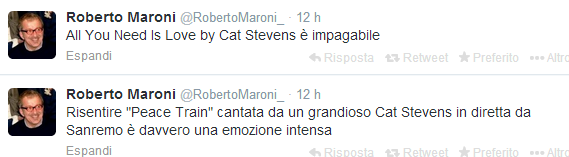 MILANO – Roberto Maroni non ha resistito al richiamo delle note di Cat Stevens e ha guardato Sanremo, sfilandosi così dal boicottaggio contro il festival dello “spreco di Stato” promosso dal suo partito, la Lega Nord. Prova ne è un messaggio, twittato dal governatore lombardo, ieri sera tardi, dopo l’esibizione del cantautore britannico sul palco dell’Ariston. “Risentire ‘Peace Train’ cantata da un grandioso Cat Stevens in diretta da Sanremo è davvero una emozione intensa”, ha scritto Maroni, che suona l’hammond nella band varesina ‘Distretto 51’.