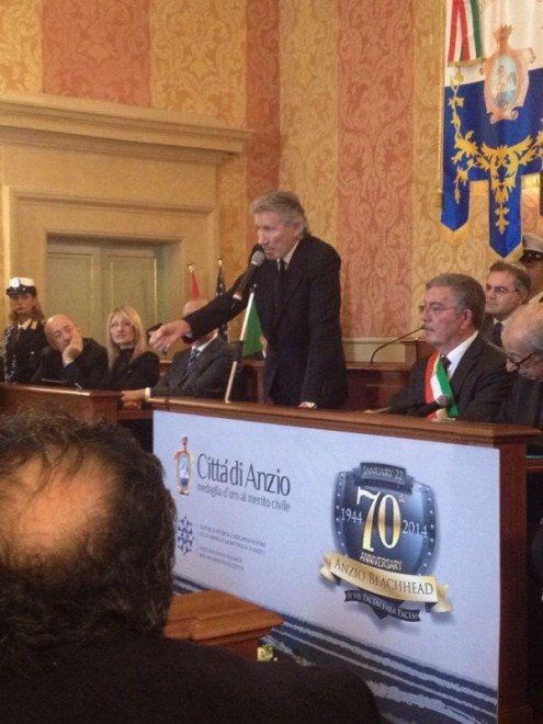 ROMA – Il mitico Roger Waters, bassista e fondatore dei Pink Floyd, da oggi è cittadino onorario di Anzio. Completo nero, camicia bianca, cravatta scura, Waters si è recato nel luogo esatto in cui il padre, Eric Fletcher Waters, morì il 18 febbraio di settant’anni fa durante le operazioni dello sbarco alleato ad Aprilia. Lì sul fosso della Moletta i tedeschi lo fucilarono e in quel punto esatto oggi è stato scoperto un monumento in suo onore. Subito dopo il musicista è andato ad Anzio dove è stato accolto dal sindaco Luciano Bruschini, che gli ha conferito la cittadinanza onoraria e con tanto di medaglia d’oro con su scritto: