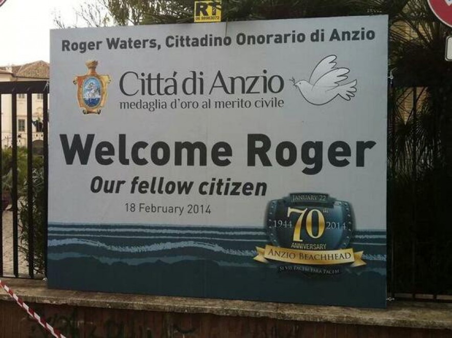 “In memoria di Eric Fletcher Waters, sbarcato ad Anzio e disperso nelle paludi della guerra, ritrovato nei nostri cuori e nel nostro desiderio di pace e libertà attraverso l’intensa Poesia di suo figlio Roger, Ambasciatore di Pace, al quale la città di Anzio con profonda gratitudine conferisce la cittadinanza onoraria”.