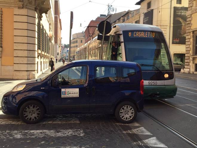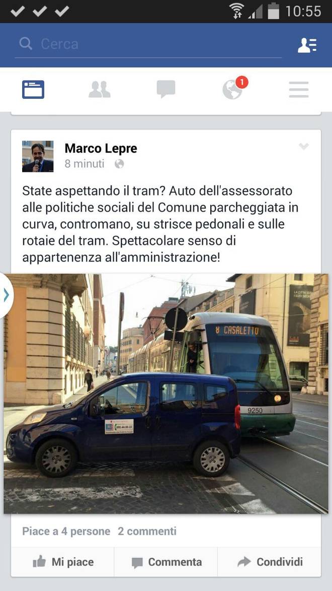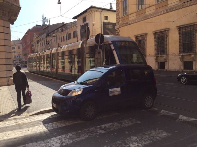 ROMA – “Un’auto dell’assessorato delle politiche sociali del Comune parcheggiata in curva, contromano, sulle strisce pedonali e sule rotaie del tram”. A scriverlo su Facebook con tanto di foto è Marco Lepre, commerciante ed ex presidente dell’associazione romana Argentina-Arenula.
