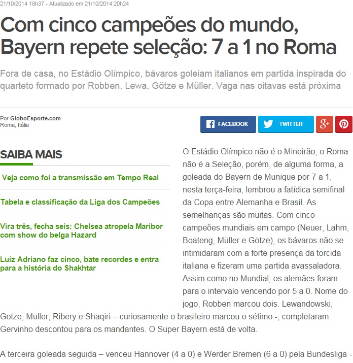 ROMA – “La Roma diventa la Selecao e perde 1-7″. Sul sito del quotidiano sportivo brasiliano ‘Lance’ viene presentata così, con questo paragone con il ‘Mineirazo’, la sconfitta interna dei giallorossi contro il Bayern Monaco. Si scrive anche di “un altro massacro tedesco” e si sottolinea come la squadra di Garcia sia stata umiliata da una rivale che aveva nelle proprie file 5 (Neuer, Lahm, Boateng, Müller e Goetze) dei protagonisti della semifinale mondiale di Belo Horizonte.