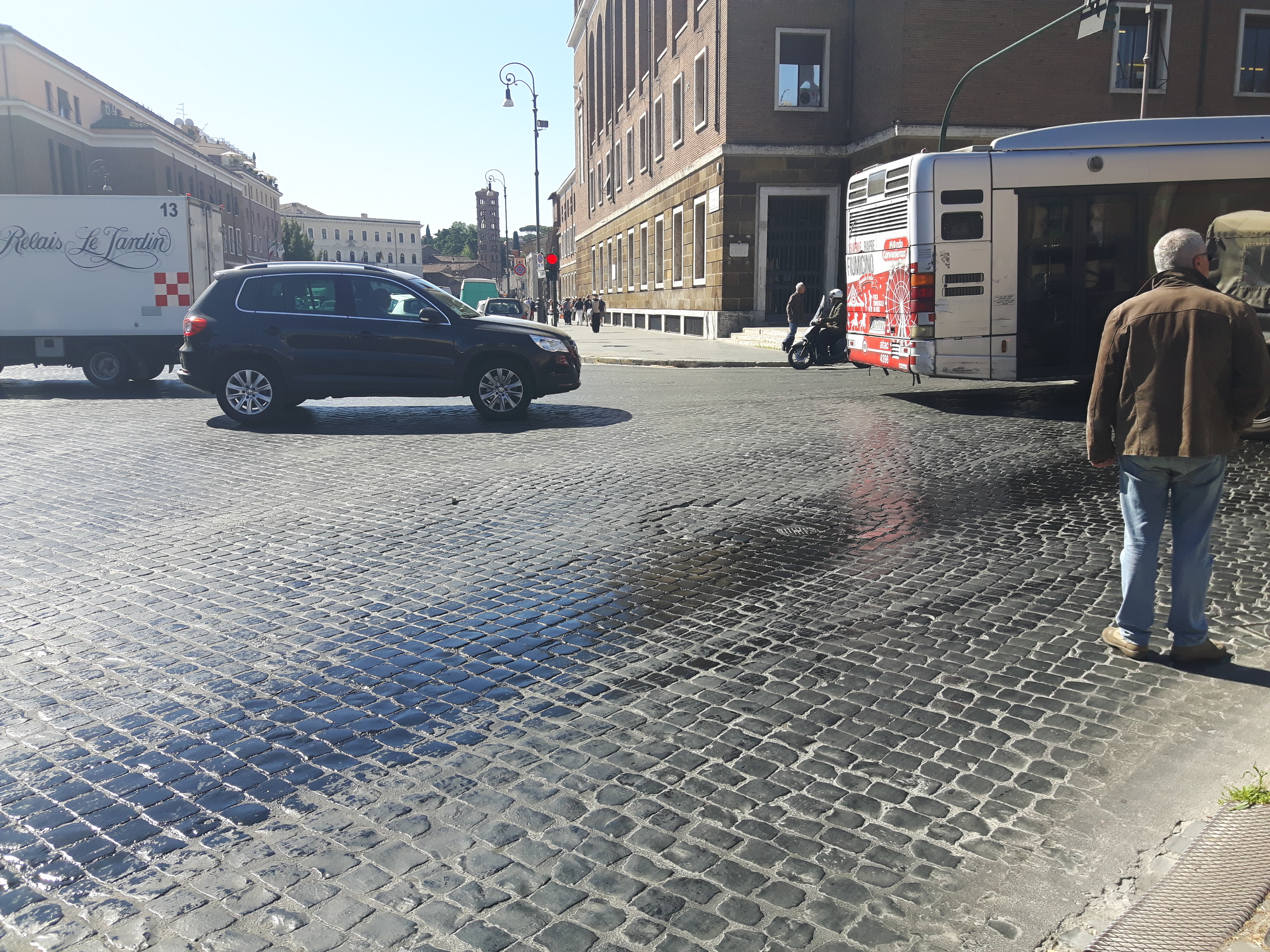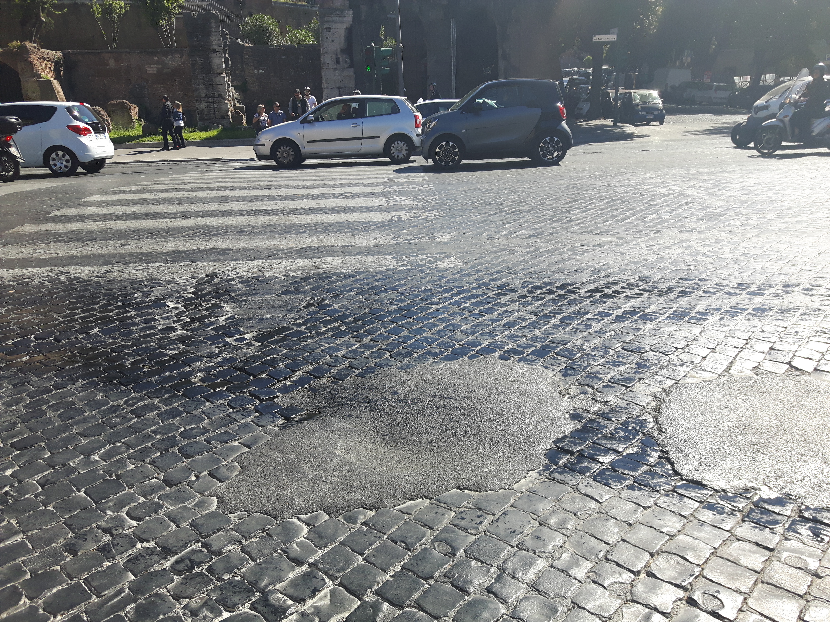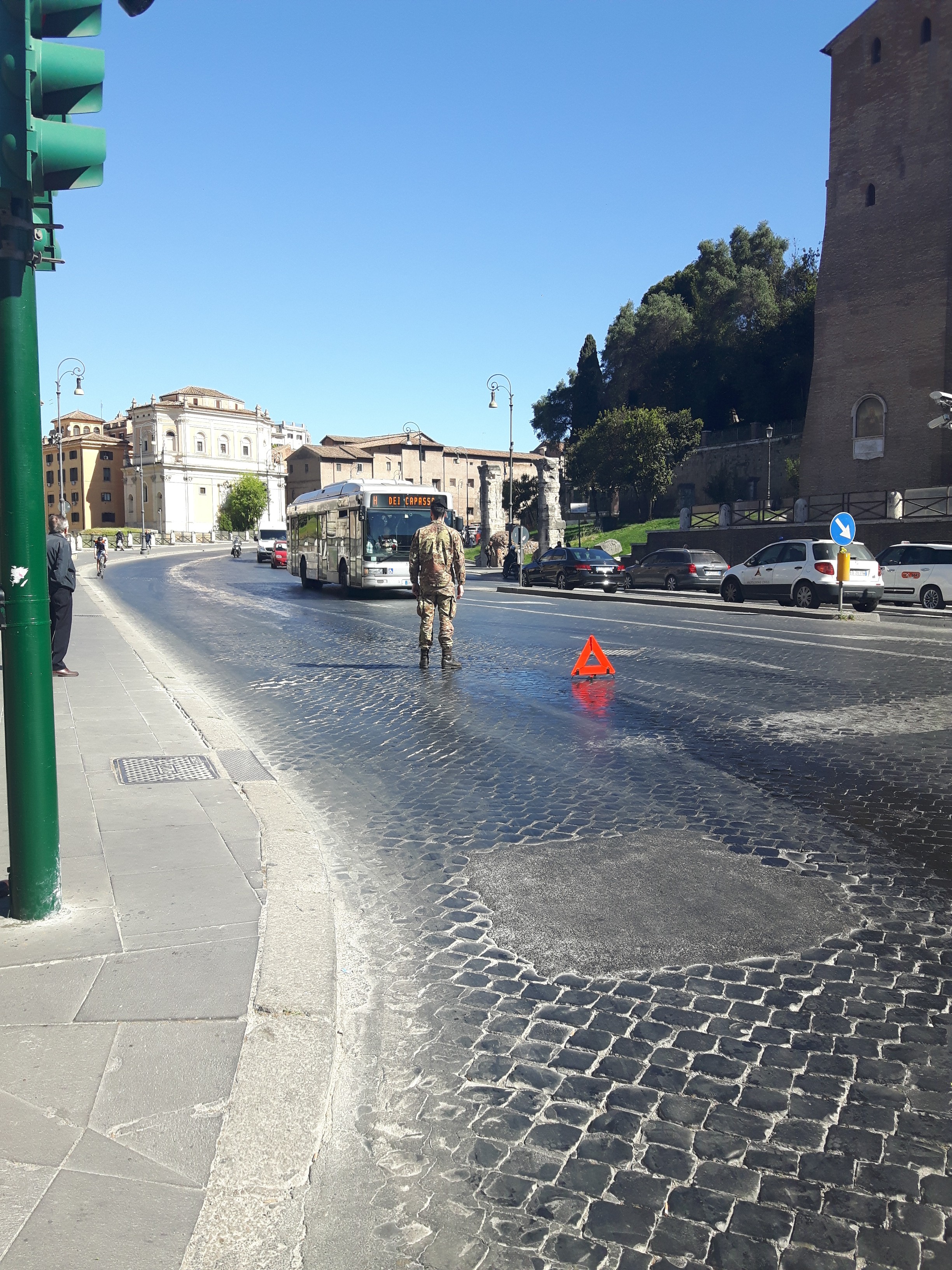 ROMA – Chiazza d’olio a Roma, e decine di motorini finiscono a terra. Accade la mattina di mercoledì 20 aprile tra via del Teatro di Marcello e la Sinagoga di Roma su Lungotevere de’ Cenci. Siamo in pieno centro, a due passi dall’anagrafe e dal Campidoglio: la scia lunga almeno un chilometro comincia proprio sotto la scalinata del Campidoglio che ospita la sede del Comune di Roma, e prosegue per via del Teatro di Marcello finendo su Lungotevere davanti alla principale Sinagoga di Roma. A causarla è stato uno dei tanti mezzi pubblici disastrati che viaggiano sulle strade di Roma.