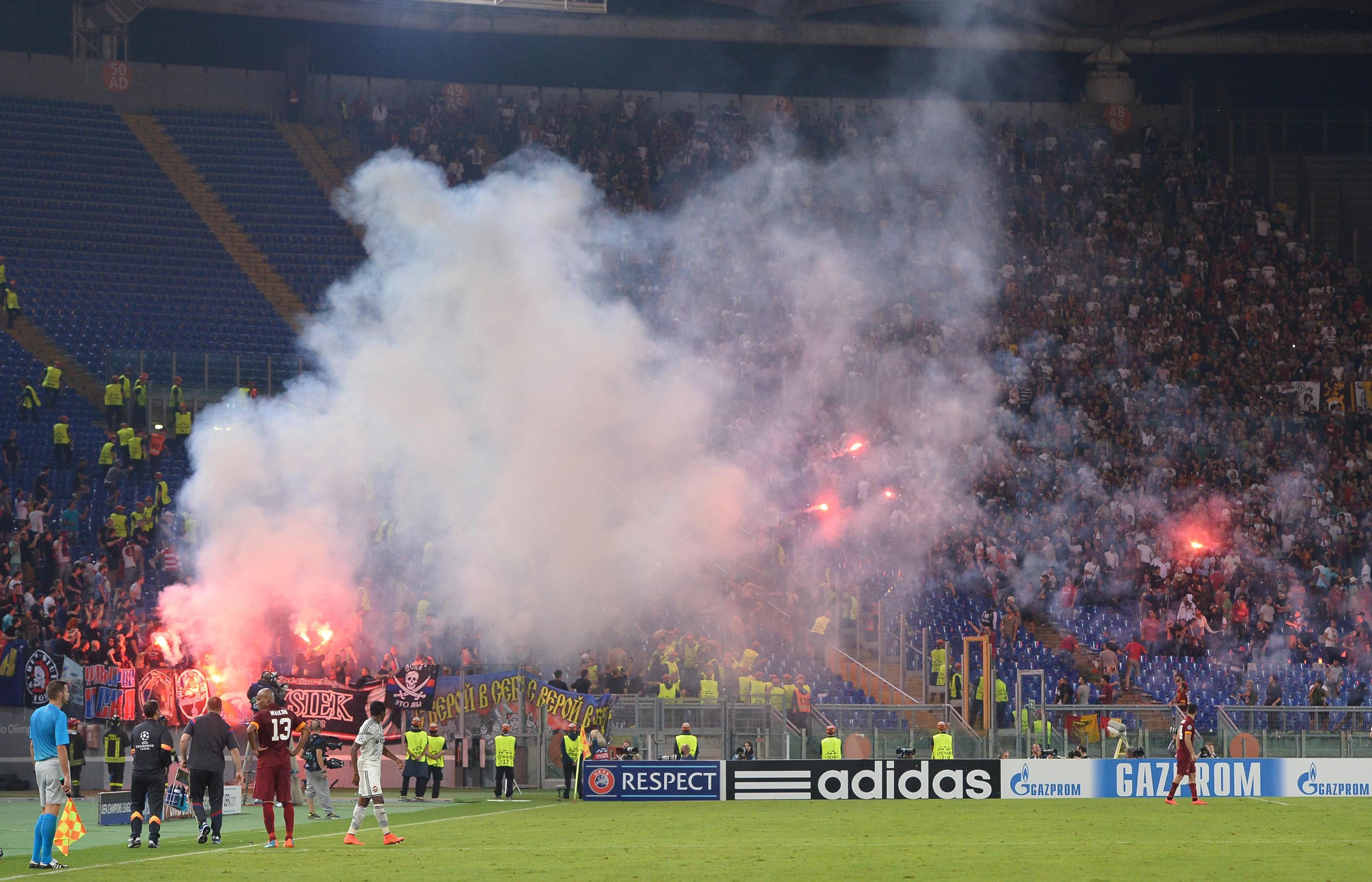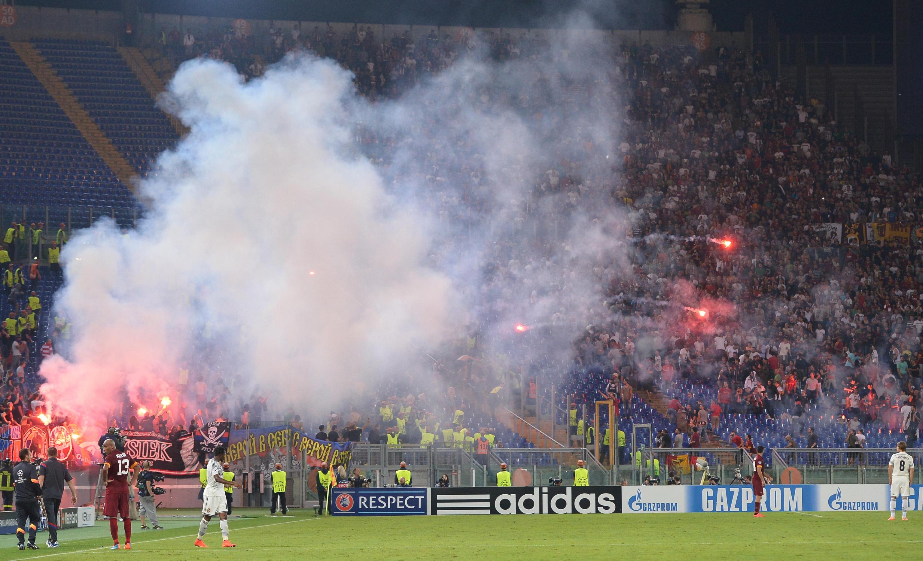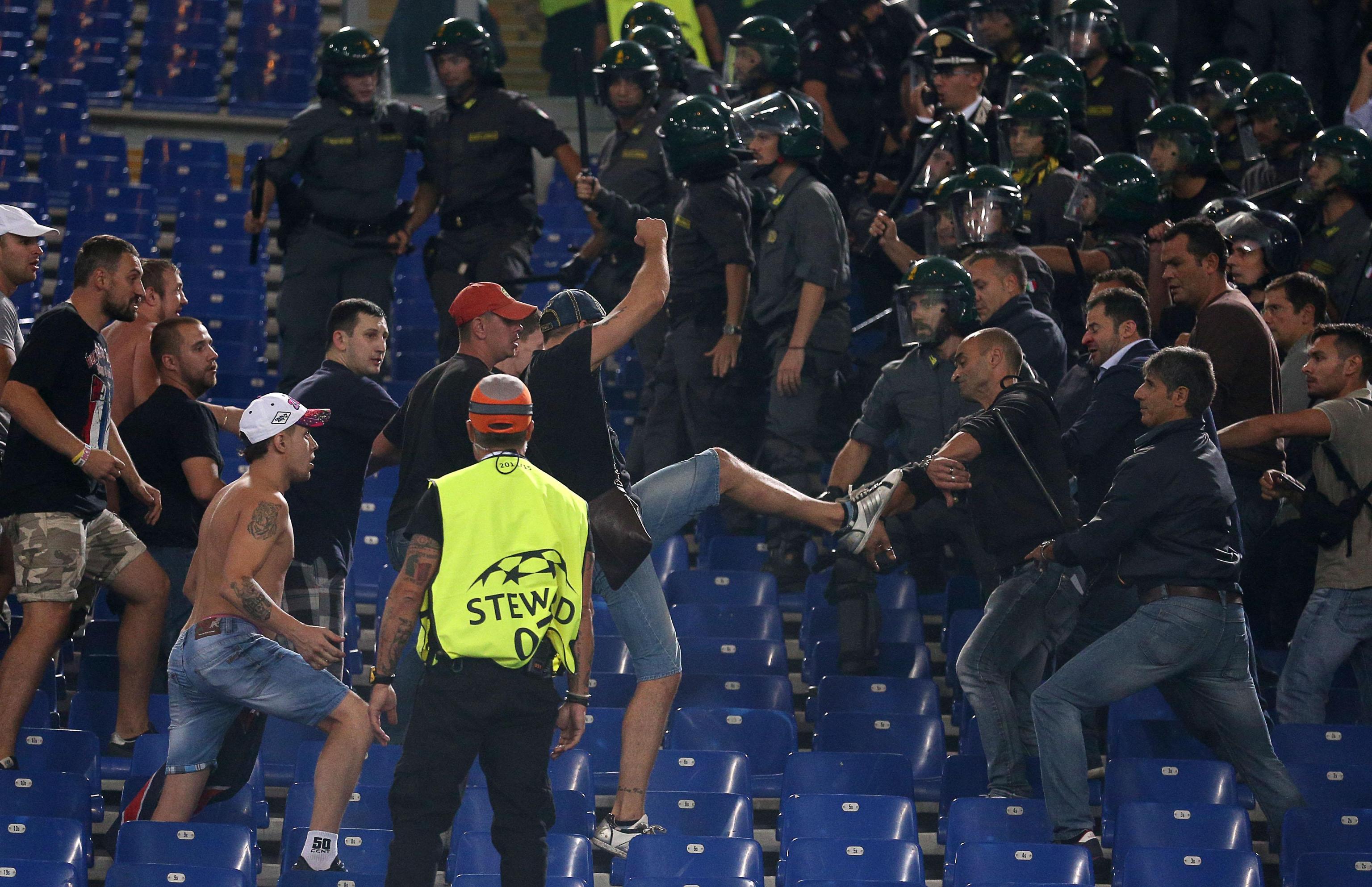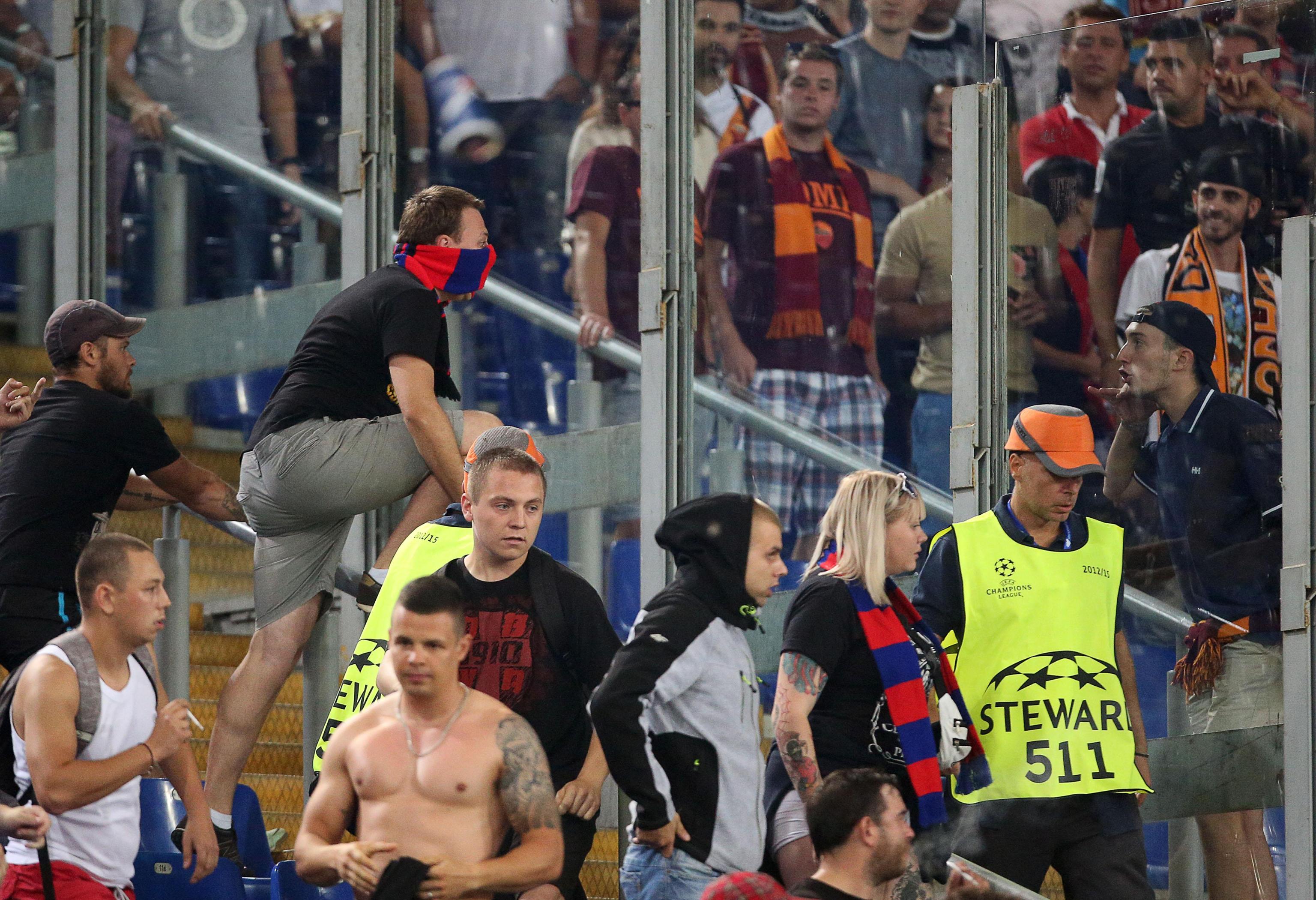 “Alcuni tifosi della squadra russa hanno iniziato dapprima un fitto lancio di fumogeni all’indirizzo dei tifosi romanisti, cercando poi di entrare in contatto con loro: si è reso necessario pertanto arginare l’azione dei tifosi della squadra moscovita con l’intervento degli steward, addetti alla sicurezza all’interno dello stadio”.