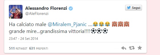 ROMA – Roma, Florenzi scherza con Pjanic su Twitter: “Hai calciato male” . La Roma vince a Parma grazie alla magia di Miralem Pjanic su punizione e tornando nella capitale Alessandroย Florenzi su Twitter non perde di certo l’occasione e scherza col bosniaco twittando ironico: “Hai calciato male!” Sul profilo ufficiale della Roma intanto continuano i festeggiamenti per la vittoria importante per il campioanto ed in queste ore รจ stato pubblicato un selfie collettivo della squadra, Totti compreso accanto a Gervinho, per festeggiare la vittoria in attesa della sfida di sabato contro il Verona.