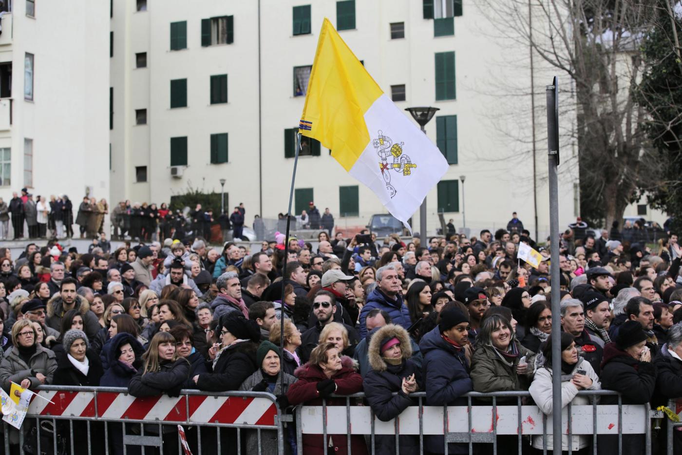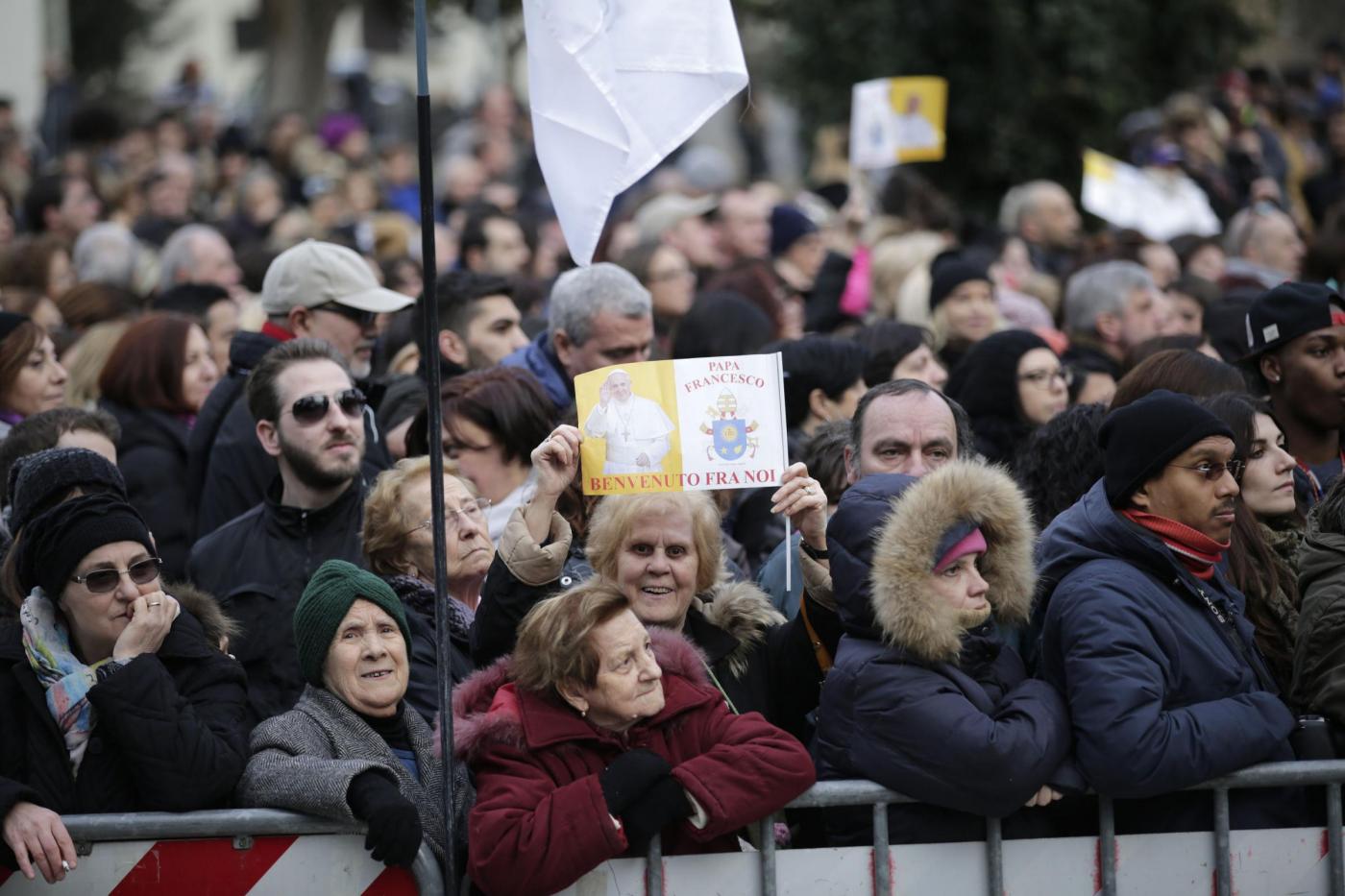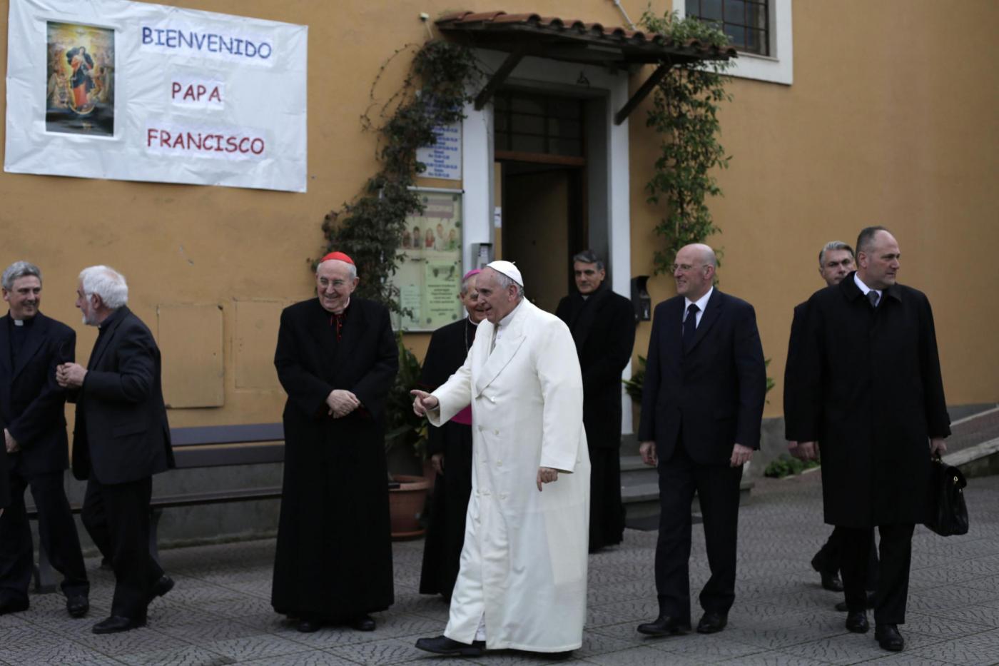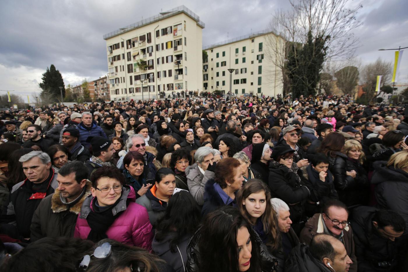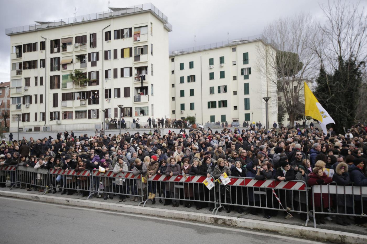 ROMA – Papa Francesco visita una parrocchia a Pietralata, popoloso quartiere alla periferia Nord Est di Roma, dove ha compiuto la decima visita ad una parrocchia della diocesi (la nona secondo le fonti ufficiali, perché Francesco ha compiuto l’anno scorso una visita non prevista dal calendario recandosi a visitare un presepe vivente a Prima Porta). Ad accoglierlo c’era una discreta folla di fedeli, tenuti a distanza con delle transenne dalla piccola chiesa rurale di San Michele Arcangelo, che risale ai primi del ‘900, attorno alla quale è sorto il quartiere. Paolo VI venne qui per inaugurare le case popolari che accerchiano la parrocchia. Con il cardinale vicario Agostino Vallini c’erano il parroco don Aristide Sana e il vescovo ausiliare monsignor Guerino Di Tora.