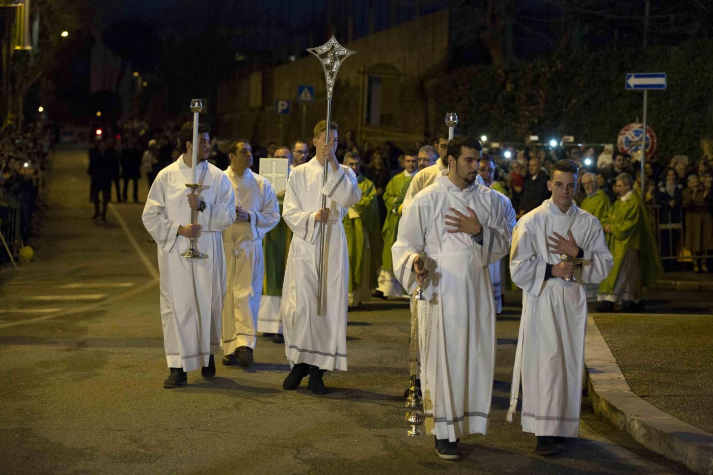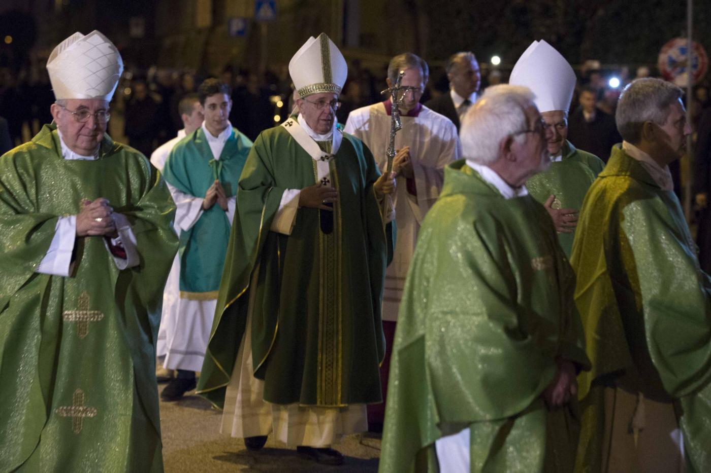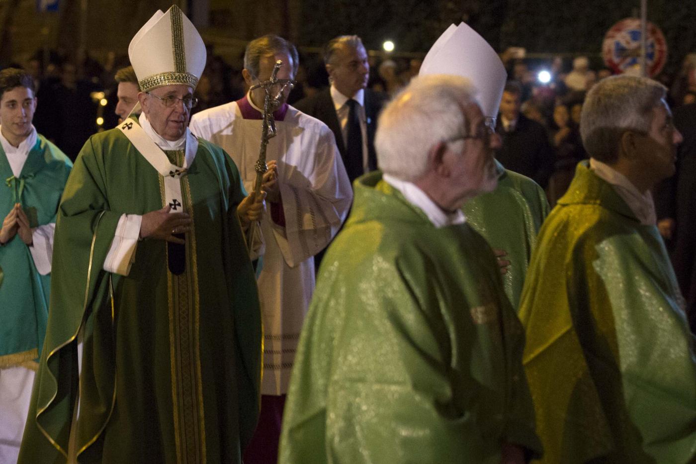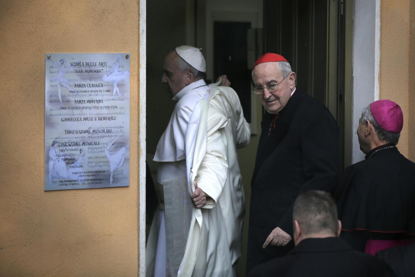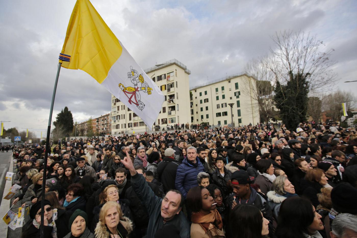 ROMA – Papa Francesco visita una parrocchia a Pietralata, popoloso quartiere alla periferia Nord Est di Roma, dove ha compiuto la decima visita ad una parrocchia della diocesi (la nona secondo le fonti ufficiali, perché Francesco ha compiuto l’anno scorso una visita non prevista dal calendario recandosi a visitare un presepe vivente a Prima Porta). Ad accoglierlo c’era una discreta folla di fedeli, tenuti a distanza con delle transenne dalla piccola chiesa rurale di San Michele Arcangelo, che risale ai primi del ‘900, attorno alla quale è sorto il quartiere. Paolo VI venne qui per inaugurare le case popolari che accerchiano la parrocchia. Con il cardinale vicario Agostino Vallini c’erano il parroco don Aristide Sana e il vescovo ausiliare monsignor Guerino Di Tora.