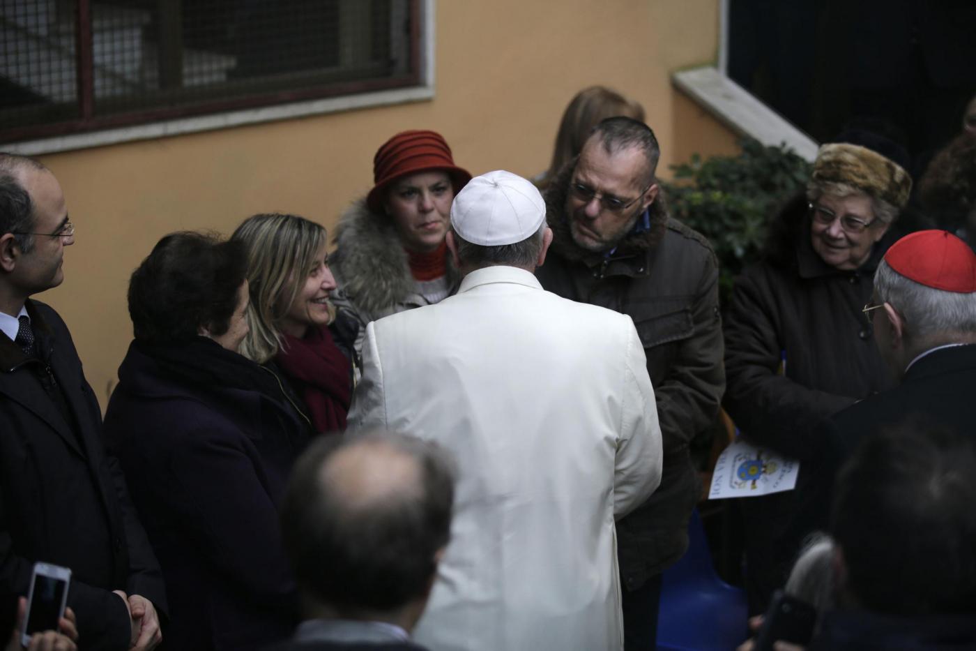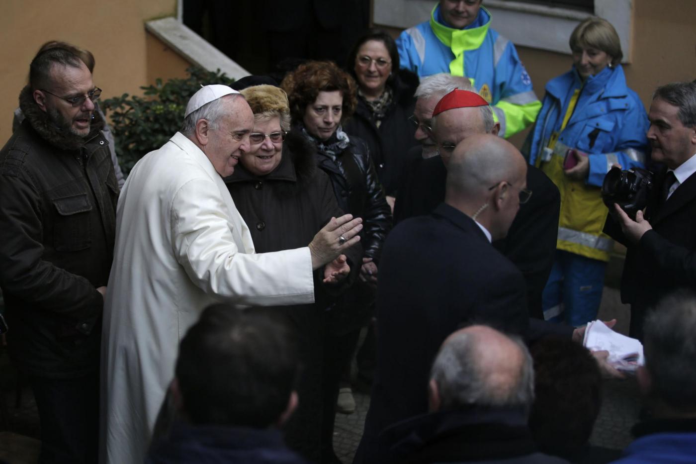 Ad accompagnare i “senza tetto”, che Francesco ha incontrato subito dopo, c’erano invece i volontari della Comunità di Sant’Egidio. A loro, Papa Francesco ha donato un centinaio di sacchi a pelo. Da alcune finestre dell’edificio parrocchiale protette da cancelli di metallo spuntavano gli obiettivi dei fotografi, e il Papa ha scherzato su questa circostanza, dicendo “saluto i fratelli carcerati”. Il Pontefice ha subito raggiunto il salone parrocchiale dove uno ad uno ha salutato un centinaio di ammalati, alcuni dei quali con le bombole ad ossigeno. Francesco ha anche ringraziato i volontari dell’Unitalsi che erano insieme ai malati, poi è salito al piano superiore per incontrare un gruppo di “senza tetto” e diversi gruppi parrocchiali tra cui degli scout e concludere i saluti iniziali incontrando i bambini e gli adolescenti che frequentano le diverse classi del catechismo.