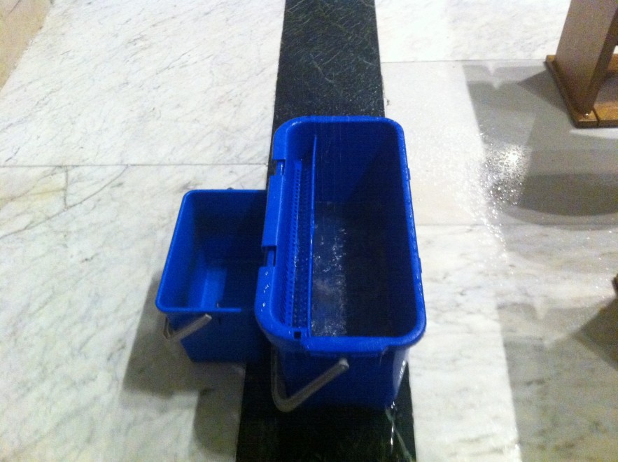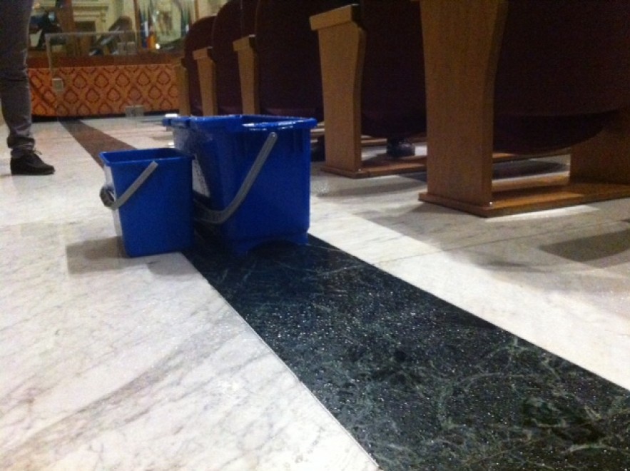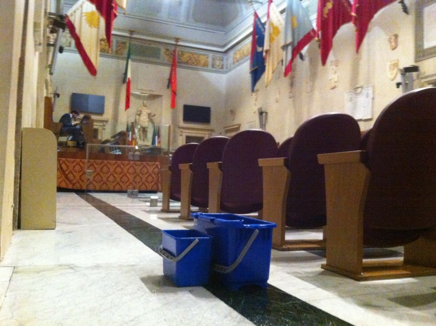 ROMA – Piove in Campidoglio a Roma, dentro il Campidoglio. Mercoledì 26 novembre la pioggia è penetrata dal soffitto nell’Aula Giulio Cesare, cioè l’aula del consiglio comunale. E qualcuno ha pensato di sistemare la situazione piazzando due secchi in mezzo alla sala nel punto in cui pioveva dal soffitto.