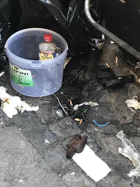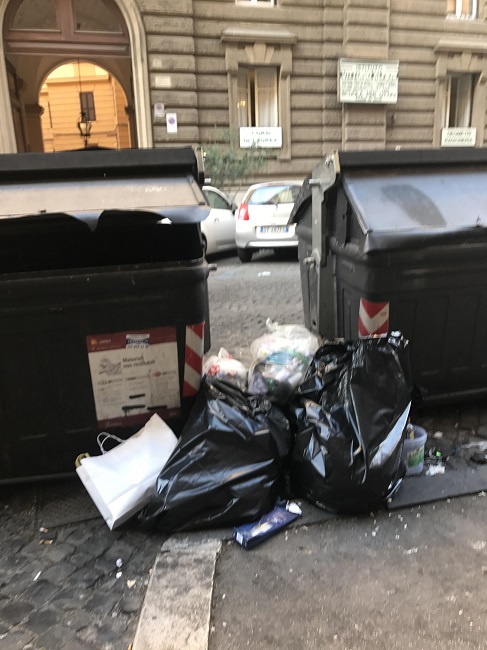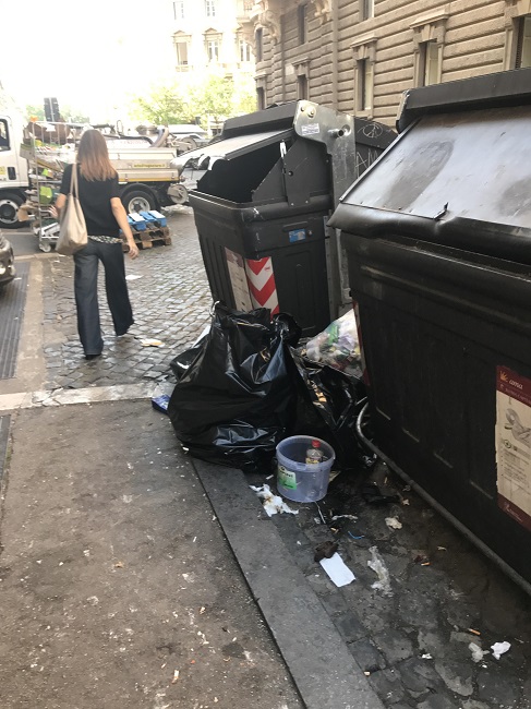 Chi esce dal supermercato e dal palazzo deve evitare la contaminazione di sporco e rifiuti: ma con le buste della spesa non c’è solo chi lì ci abita, frotte di turisti cercano qui di evitare i salassi di bar e camioncini ambulanti. Tornati in patria, sicuri che la prima cosa che racconteranno della città eterna riguarderà arte, storia, spiritualità ? Il ristorante più in là , in attesa degli spazzini e dei camion dell’Ama, si è premunito da solo: i cassonetti in realtà erano di fronte alle sue insegne in principio. Poi si è deciso di spostarli perché con i tavolini all’aperto… Adesso, dopo aver visto di tutto ci mancava anche l’escremento umano. E chi lo leva?
