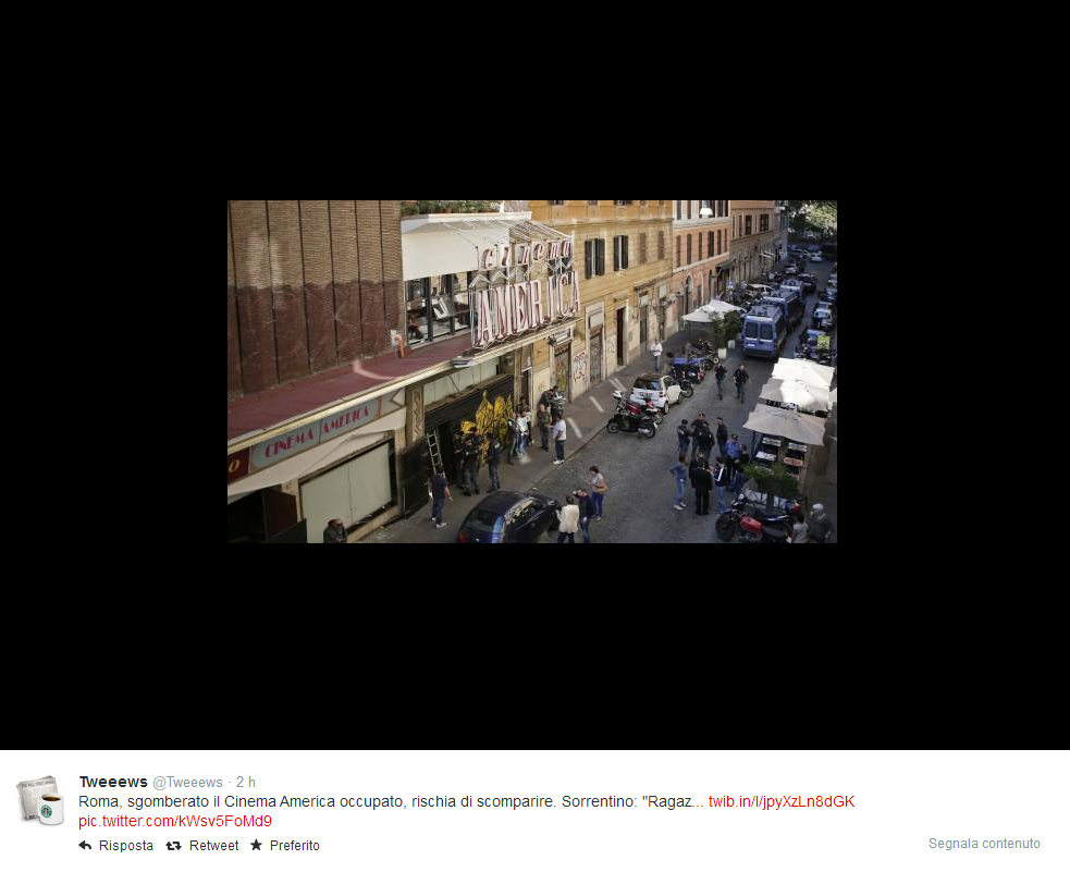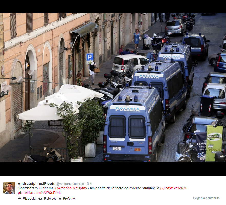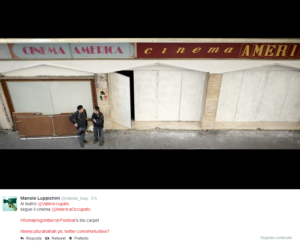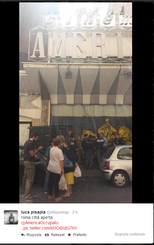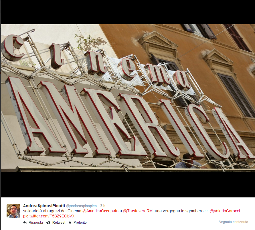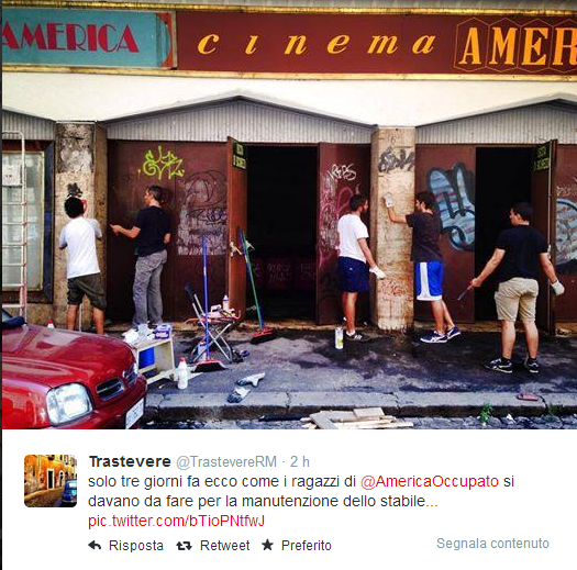 L’ex cinema America, come il Teatro Valle, era luogo di un’occupazione storica nella Capitale. Cominciata nel 2012, l’occupazione era nata per impedire che il cinema, aperto nello storico rione di Trastevere negli anni Cinquanta, venisse abbattuto per diventare una palazzina con garage sottostanti.
