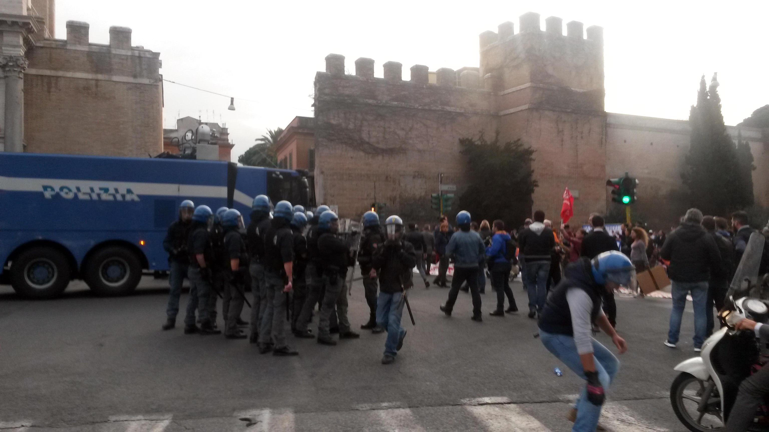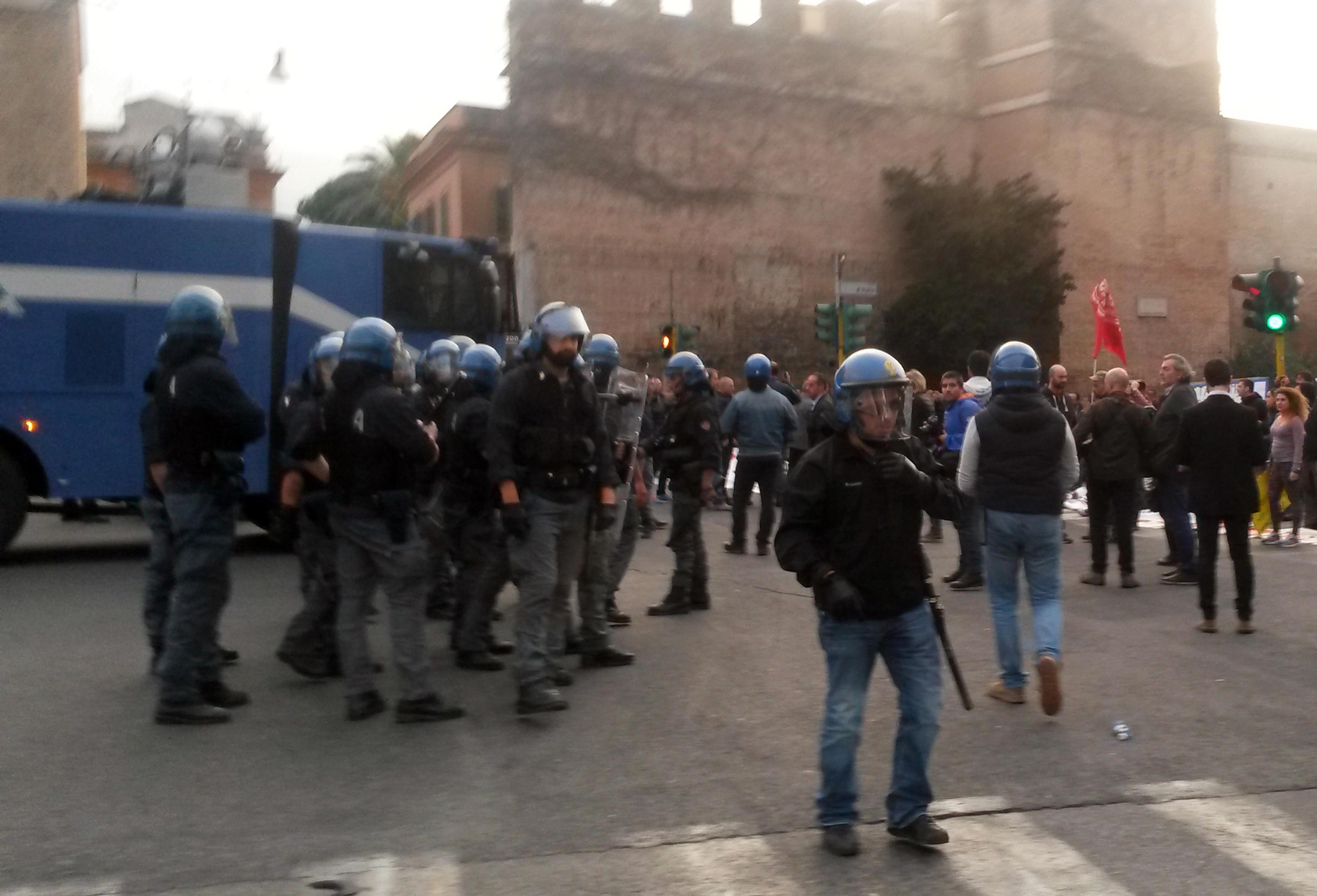 Le forze dell’ordine hanno usato gli idranti per sgomberare il sit in. Il getto di un idrante ha anche abbattuto un semaforo. Gli agenti hanno reagito al lancio di oggetti e sassi usando gli idranti. Una manifestante, rimasta ferita, è stata soccorsa dagli uomini del 118 che le hanno steccato una gamba. La donna è stata poi portata in ospedale.