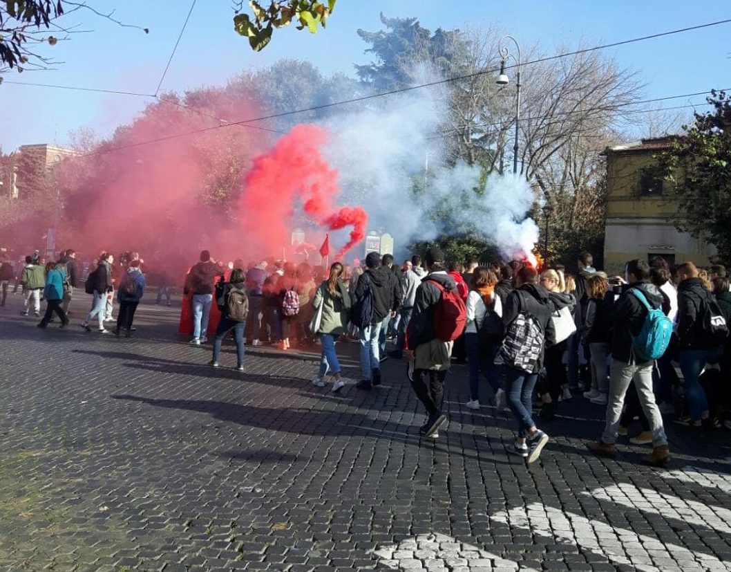 Dopo il ministero del Lavoro, gli studenti romani sono arrivati al ministero dell’Istruzione di viale Trastevere, dove hanno acceso fumogeni e messo musica alta, bloccando il traffico per tutta la mattinata (in fondo all’articolo le foto di Blitz Quotidiano).