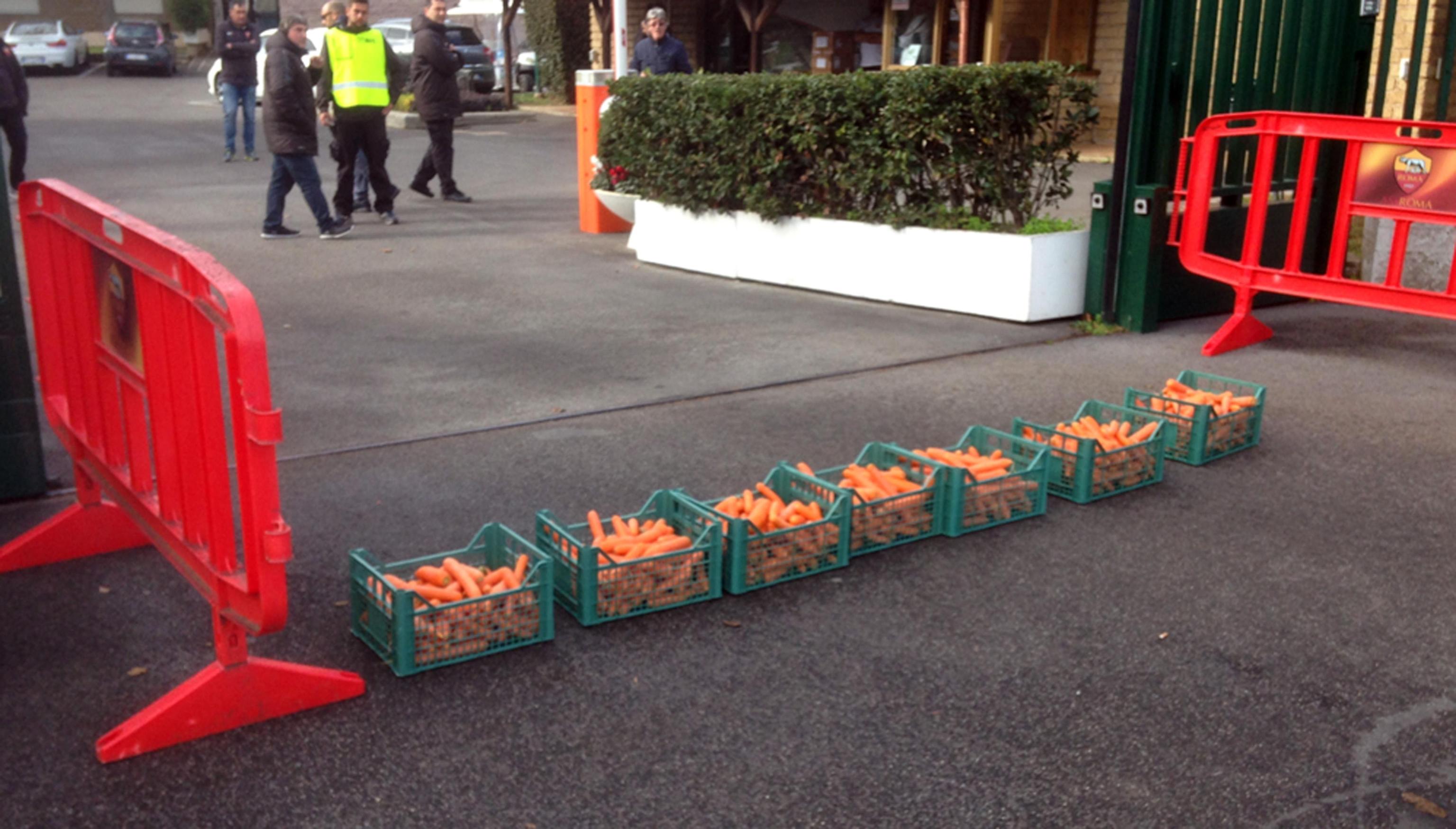 ROMA – Sette casse piene di carote posizionate davanti all’ingresso principale di Trigoria, accompagnate da un eloquente striscione con sopra scritto: “Buon appetito conigli!”. È questo il modo in cui una cinquantina di tifosi della Roma ha deciso di contestare all’esterno del centro sportivo giallorosso, la squadra di Rudi Garcia. I sostenitori romanisti hanno anche intonato cori di protesta contro società e giocatori.