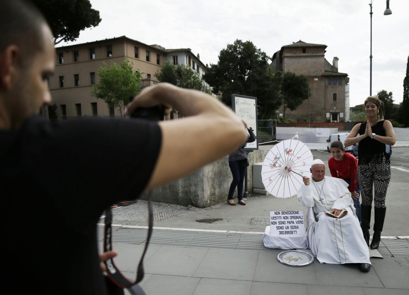 In molti si fermano, lo osservano e poi scattano con lui alcune immagini in cambio di qualche moneta. Centinaia di migliaia di pellegrini e fedeli raggiungeranno Roma in questi giorni per partecipare alla cerimonia (foto LaPresse)