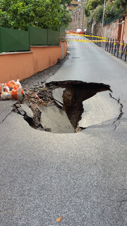 A mostrare le foto della voragine su Facebook è un residente che ha commentato così lo “spettacolo” della strada inghiottita che si è trovato davanti dopo le violente precipitazioni su Roma tra la notte del 19 e la mattina del 20 maggio: