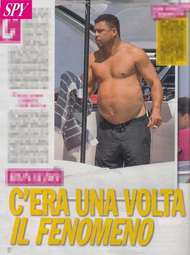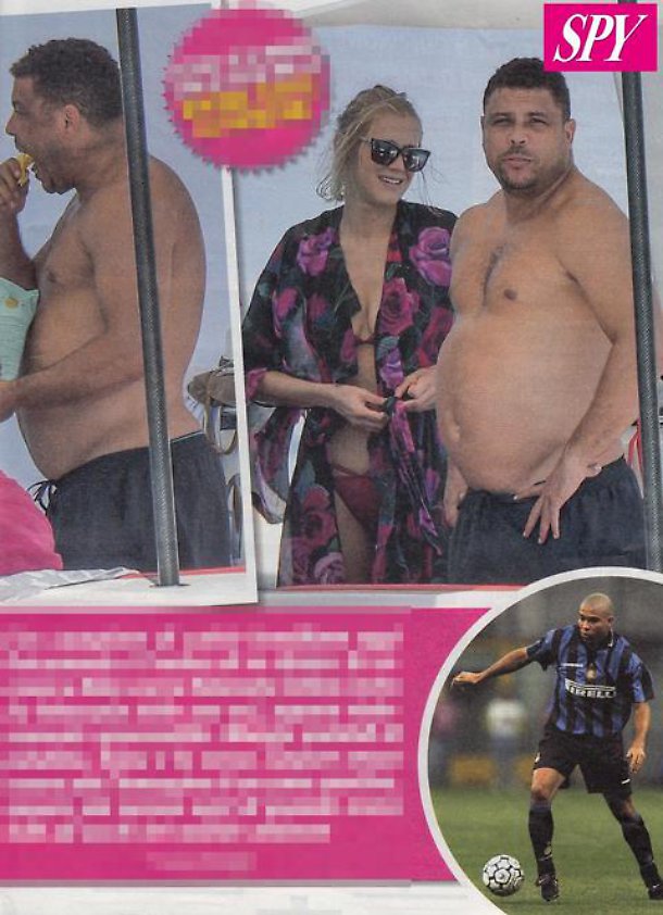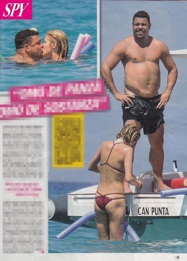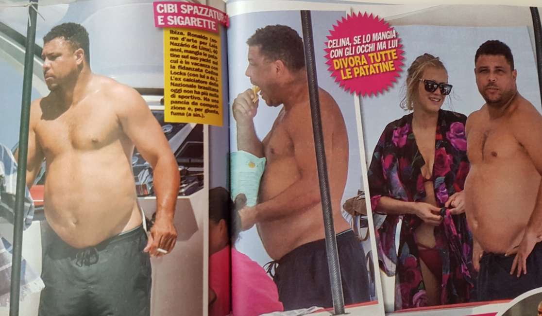 Il Fenomeno è stato ora paparazzato da Spy, il nuovo settimanale di gossip di Alfonso Signorini, in compagnia della fidanzata, la modella Celina Locks. I due stanno trascorrendo una vacanza in barca ad Ibiza: lei ha un fisico scolpito, lui assomiglia più ad un Buddha. Ronaldo viene fotografato mentre divora delle patatine e fuga una sigaretta. Poi l’ex calciatore si concede un bagno con un bel tuffo. Malgrado il fisico, Ronaldo sembra sereno come a voler dire che per una bella dieta c’è tempo.