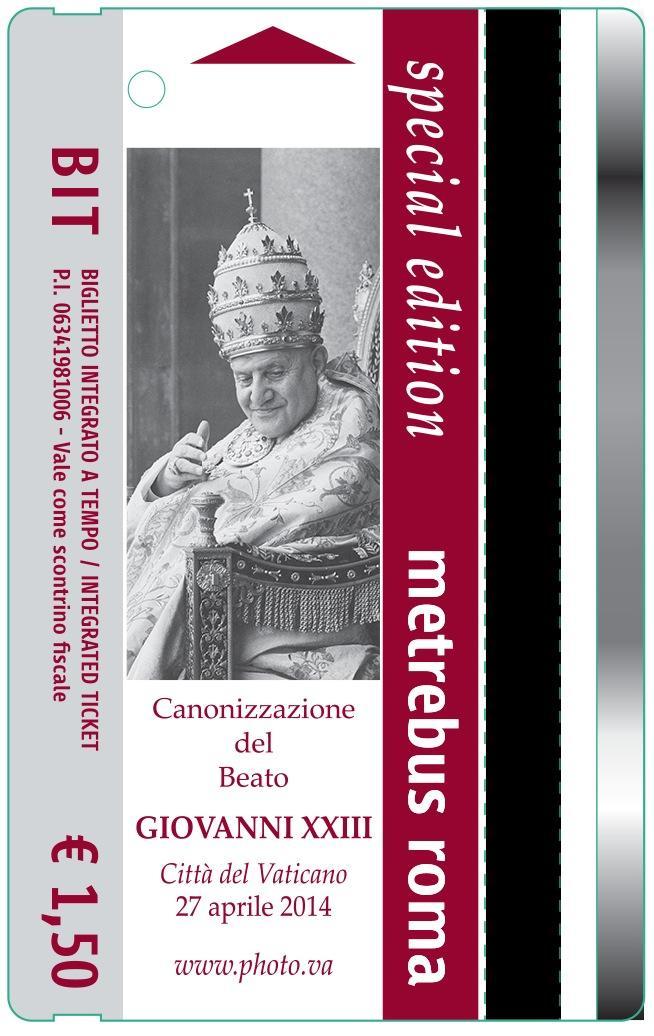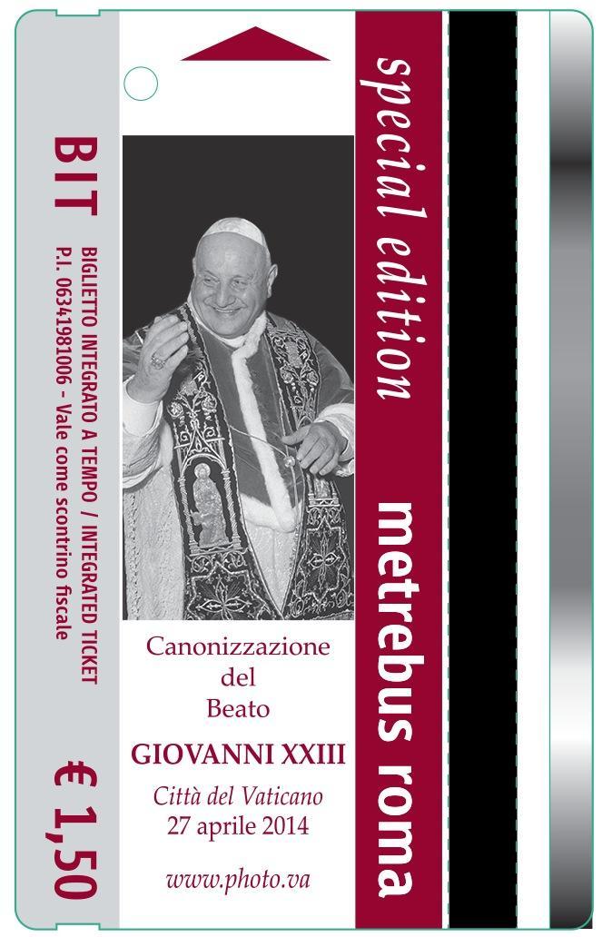 Questa “Special Edition Papa Bit” è un ticket per bus e metro ed è stato stampato dall’Atac, l’azienda dei trasporti capitolina, in edizione limitata. L’idea di stampare questi due milioni di biglietti Bit in edizione limitata, vuole essere un omaggio alla canonizzazione di Wojtyla e del “papa buono” Roncalli che avverrà il prossimo 27 aprile. In questa data, Roma si prepara ad un evento che richiamerà migliaia di fedeli da tutto il mondo (foto Ansa)