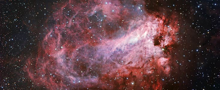 ROMA – Una rosa cosmica che ospita una culla di stelle. Questa la spettacolare foto dell’Eso che ritrae la nebulosa Messier 17 scattata dal telescopio dell‘osservatorio di La Silla in Cile. La foto mostra una nube rosa nello spazio costituita da gas e polvere che si estende per una distanza di 15 anni luce. Questo materiale alimenta la produzione di nuove stelle e il grande campo coperto da questa immagine rivela molte stelle, sia di fronte, che dietro e all’interno di Messier 17.