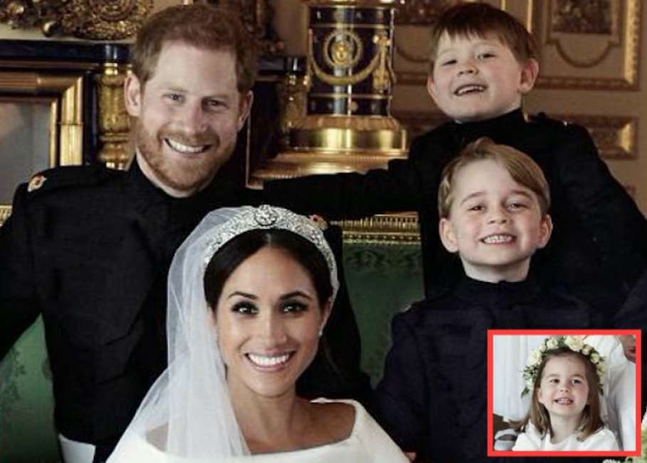 Tra loro, l’assoluto protagonista è George, che appare in foto con un sorriso furbo. Insieme a George vestito da paggetto c’è Charlotte vestita da damigella d’onore. I due piccolini erano così dolci e adorabili da aver rubato la scena ai protagonisti della giornata, i due neo-coniugi. E secondo quanto scrive Dagospia, Harry sembra non gradire troppo sorridendo in modo non spontaneo.