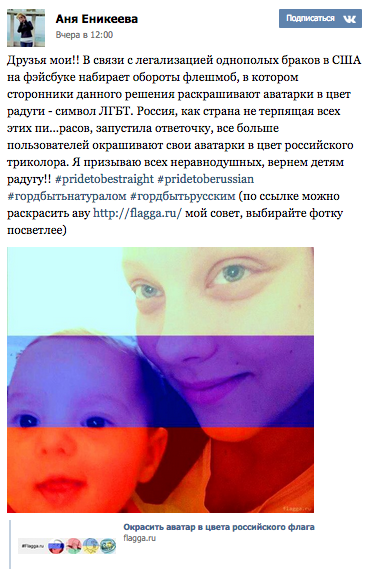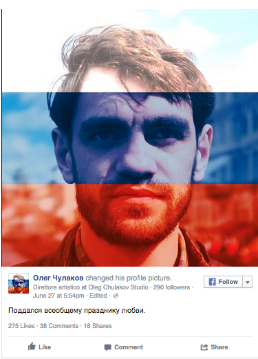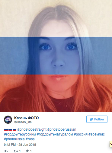 La trovata non è però piaciuta alla Russia da sempre schierata contro leggi che riconoscano diritti alle coppie gay. E così, diversi utenti dei social network hanno deciso di colorare i propri profili con la bandiera nazionale per rivendicare il proprio “orgoglio nazionale” attraverso una nuova app creata ad hoc. L’inventore è il designer grafico Oleg Chulakov che ha spiegato di aver voluto realizzare questa app solo in segno patriottico. Molti hanno però deciso di usarla per celebrare una sorta di “orgoglio etero” ed hanno accompagnato la scelta con gli hashtag #pridetobestraight e #pridetoberussian.
