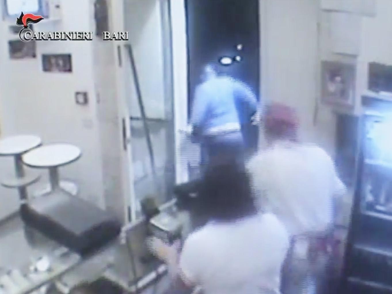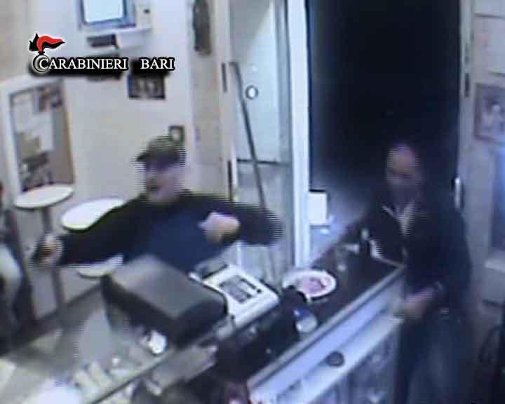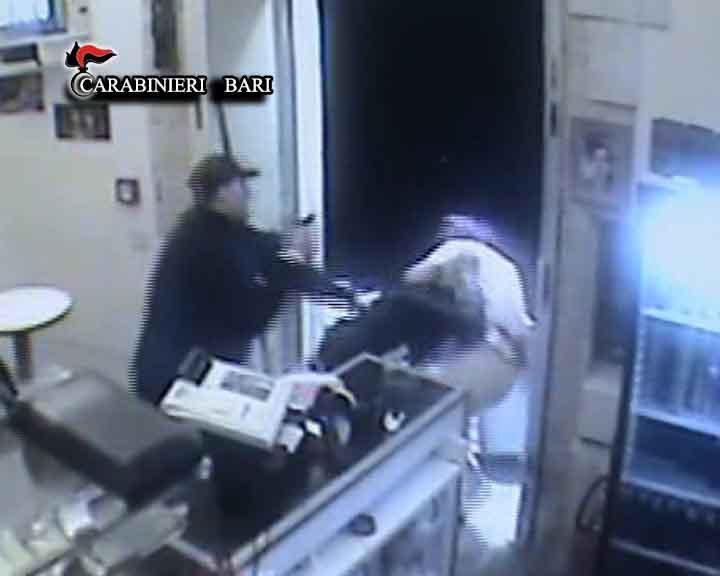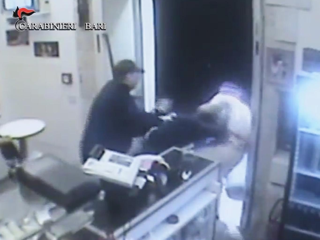 BARI – Ha puntato la pistola al volto di un dipendente di una pizzeria durante una rapina tentando più volte di fare fuoco, ma l’arma si è inceppata e poco dopo il rapinatore è stato arrestato dai carabinieri assieme ad un complice. E’ accaduto a Ruvo di Puglia (Bari). La sequenza è stata ripresa dal circuito di videosorveglianza della pizzeria. Gli arrestati sono Francesco Cipriani, di 36 anni, che era già agli arresti domiciliari, e Vittorio De Lia, di 37 anni, entrambi di Terlizzi.