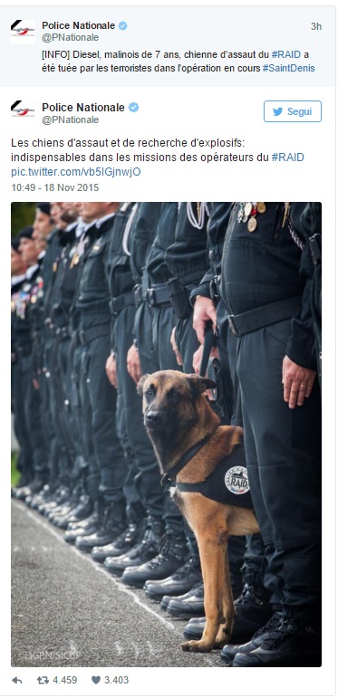 PARIGI – Fonti della polizia a Saint-Denis, dove è avvenuto il blitz contro il covo della “mente” degli attentati terroristici di Parigi, hanno fatto sapere che un cane poliziotto è rimasto ucciso proprio all’inizio delle operazioni.