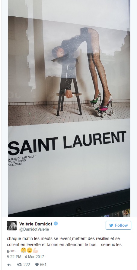 PARIGI – Yves Saint Laurent realizza una campagna pubblicitaria per le strade di Parigi che ha scatenato un mare di polemiche. La casa di moda ha suscitato le ire di molti che ne chiedono il ritiro. L’hastag che chiede il ritiro dei manifesti in cui appare una ragazza riversa su uno sgabello, con calze a rete, tacchi a spillo, pattini ai piedi e braccia a penzoloni è #YSLRetireTaPubDegradante.