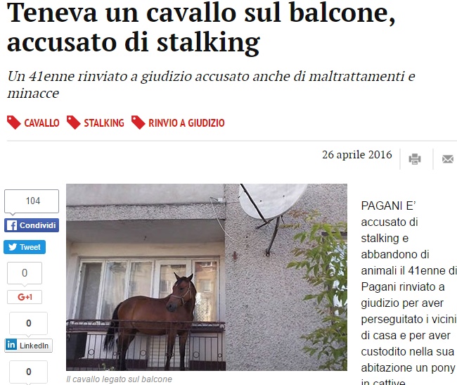 Aveva un cavallo sul balcone di casa, legato alla ringhiera. Per questo un 41enne di Pagani, in provincia di Salerno, dovrà rispondere dinanzi a un giudice di danneggiamento e abbandono di animali. Il proprietario del cavallo, però, è anche accusato di stalking, minacce, ingiurie e atti osceni nei confronti di alcuni suoi condomini. Tra le persone offese c’è, in particolare, un’anziana condomina che sarebbe stata anche oggetto di richieste di denaro da parte del 41enne. Che, in altre occasioni, sarebbe addirittura arrivato a danneggiare l’auto di una coppia dopo che i coniugi avevano contestato la presenza dell’animale sul balcone.
