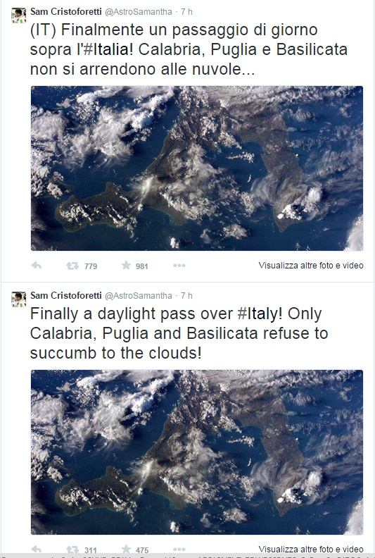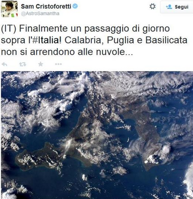 ROMA – Samantha Cristoforetti continua a pubblicare su Twitter immagini scattate direttamente dalla Iss con il nome @Astrosamatha: “Finalmente un passaggio di giorno sopra l’#Italia! Calabria, Puglia e Basilicata non si arrendono alle nuvole”, scrive l’astronauta salita a bordo lo scorso 22 novembre.