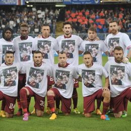 GENOVA, STADIO LUIGI FERRARIS “MARASSI” – I calciatori della Roma sono entrati in campo indossando una maglietta con la foto di Stefano e Cristian De Amicis, padre e figlio tifosi della Roma, morti in un incidente stradale martedì sera di ritorno dalla partita di Champions Roma-Bayern.