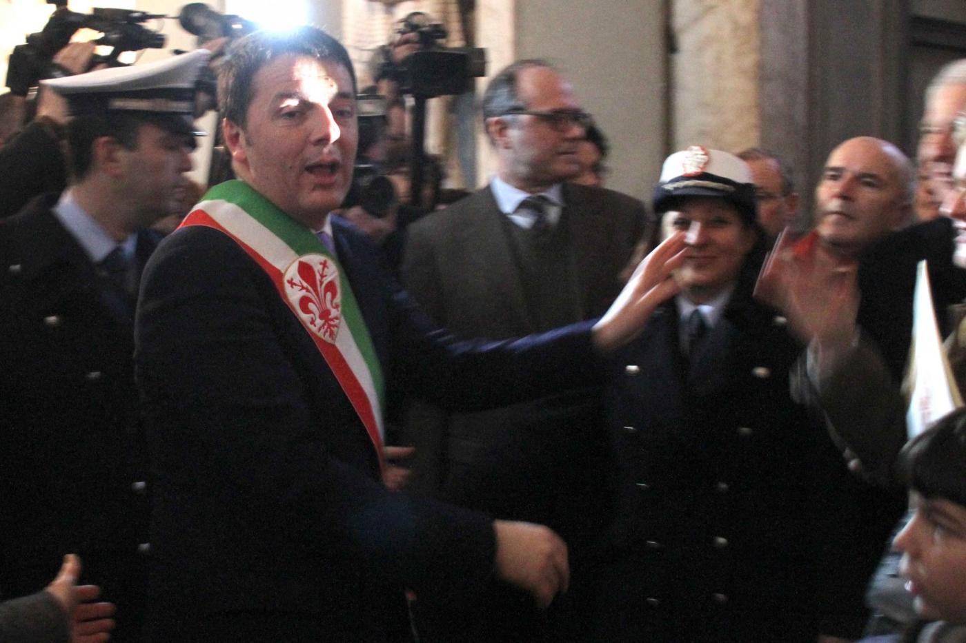 “E nel Salone dei Cinquecento strapieno di coppie accompagnate da figli armate di macchine fotografiche per immortalare il momento scoppia un applauso per la battuta del sindaco di Firenze. Per lui sono gli ultimi impegni a Palazzo Vecchio. Forse proprio l’incontro di San Valentino potrebbe essere l’ultimo saluto ai cittadini del sindaco di Firenze perché già oggi pomeriggio l’attuale premier Enrico Letta andrà a dimettersi al Quirinale e il Capo dello Stato Napolitano potrebbe afffidargli l’incarico già nelle prossime ore”.