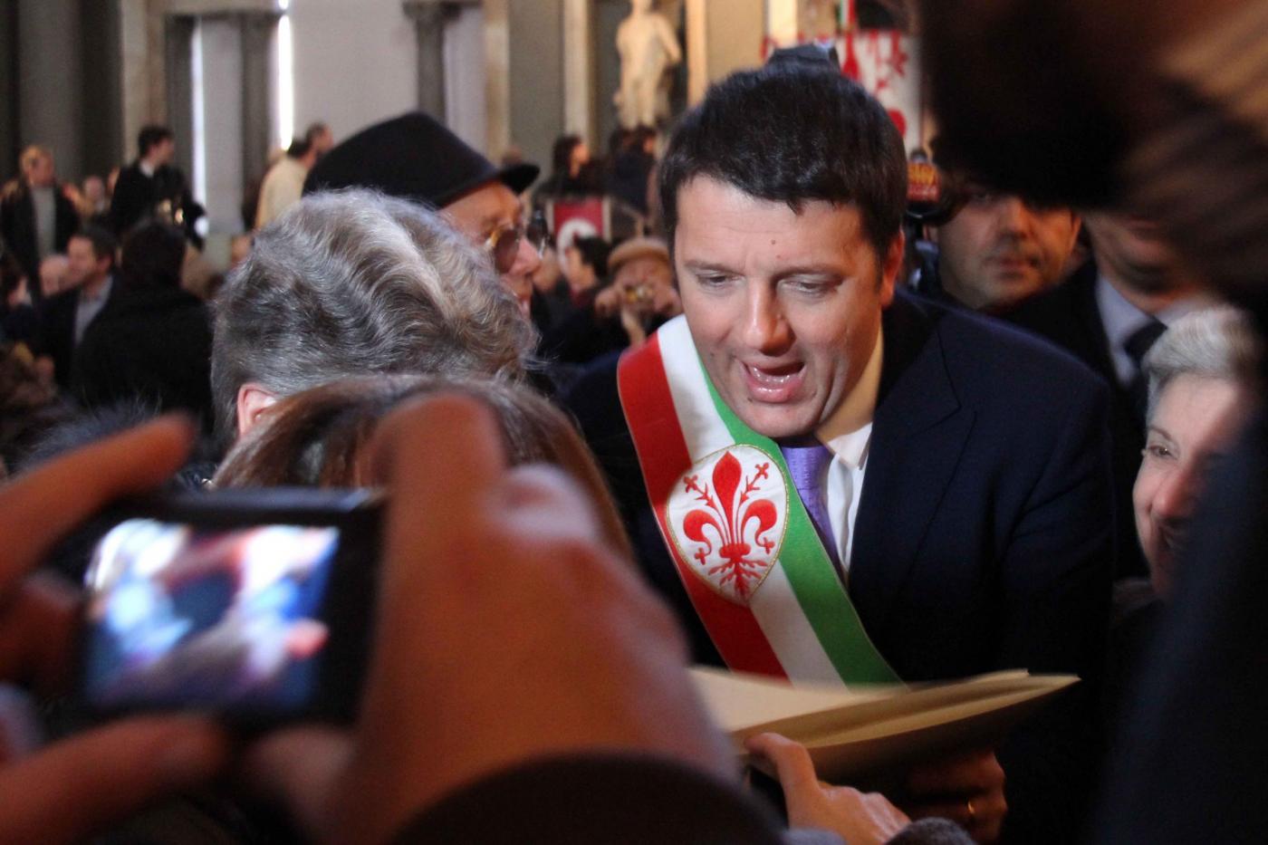 “E nel Salone dei Cinquecento strapieno di coppie accompagnate da figli armate di macchine fotografiche per immortalare il momento scoppia un applauso per la battuta del sindaco di Firenze. Per lui sono gli ultimi impegni a Palazzo Vecchio. Forse proprio l’incontro di San Valentino potrebbe essere l’ultimo saluto ai cittadini del sindaco di Firenze perché già oggi pomeriggio l’attuale premier Enrico Letta andrà a dimettersi al Quirinale e il Capo dello Stato Napolitano potrebbe afffidargli l’incarico già nelle prossime ore”.